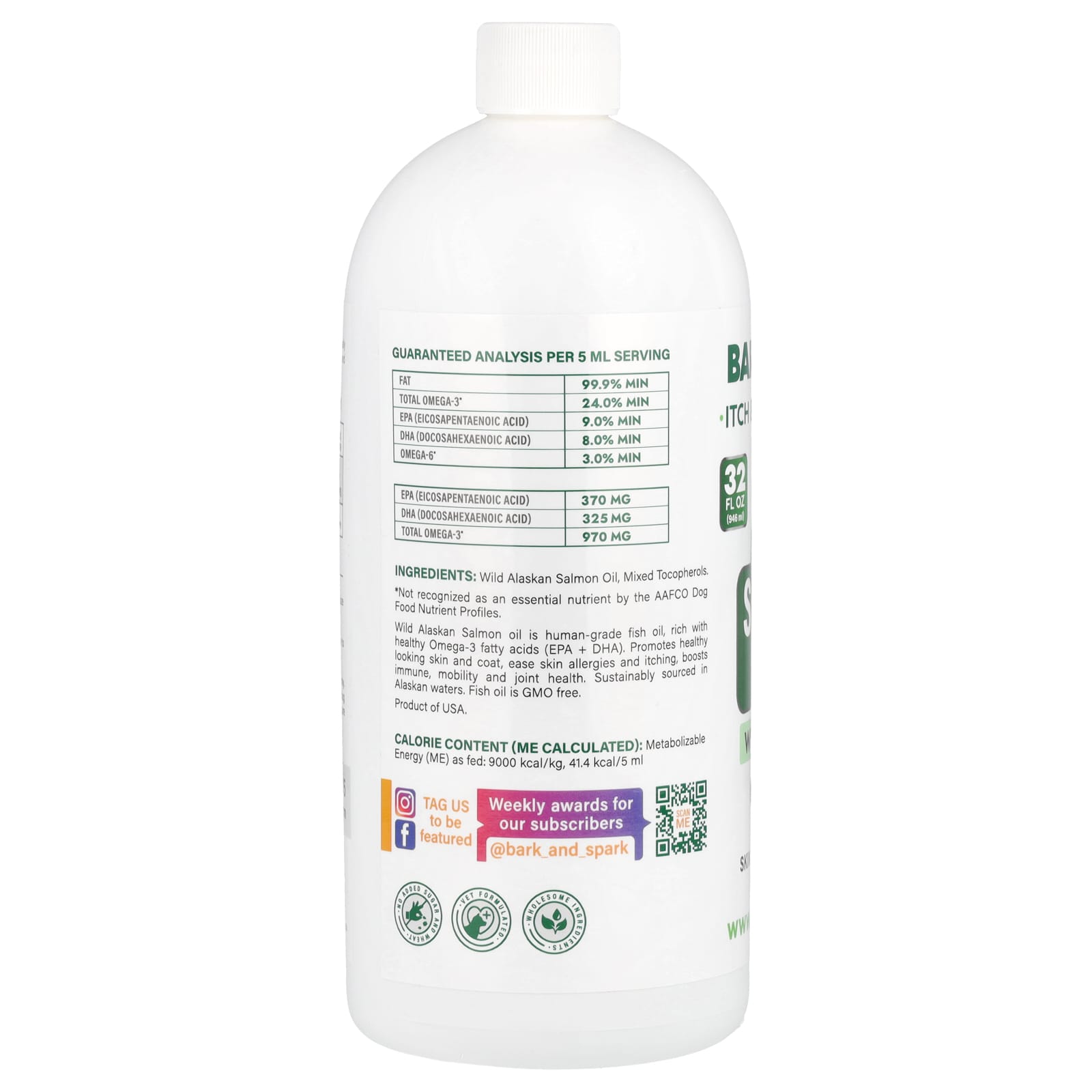 *Some information on the Bark&Spark, Salmon Oil, For Dogs & Cats, 32 fl oz (946 ml)label may be missing, or it may have been written incorrectly. We work hard to keep the information accurate & up to date. Please let us know if you discover any errors.