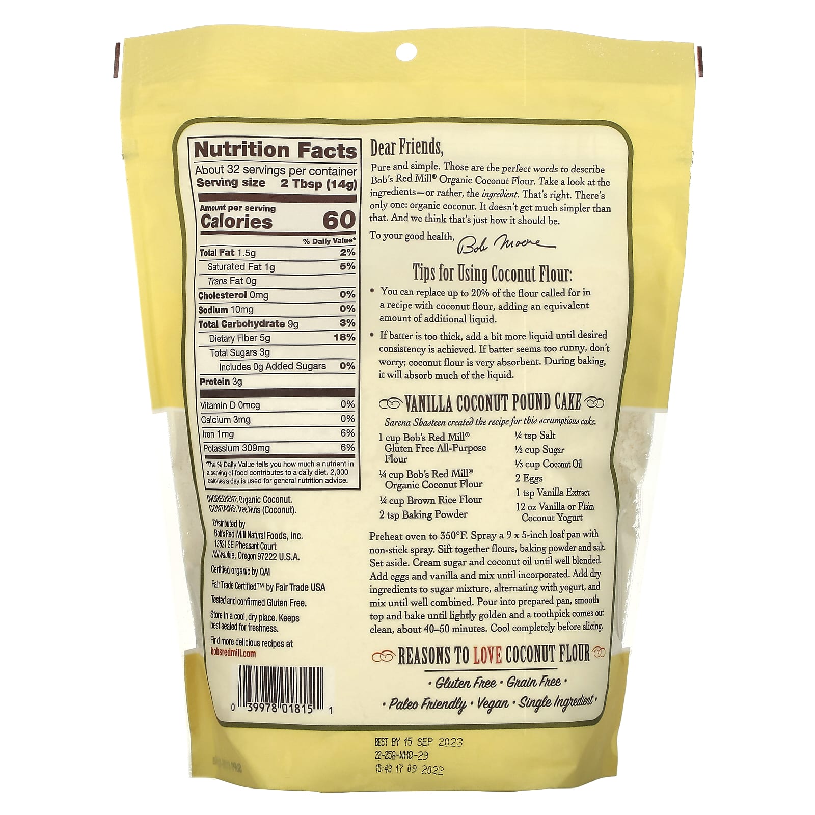 *Some information on the Bob's Red Mill, Organic Coconut Flour, Gluten Free, 1 lbs (453 g)label may be missing, or it may have been written incorrectly. We work hard to keep the information accurate & up to date. Please let us know if you discover any errors.