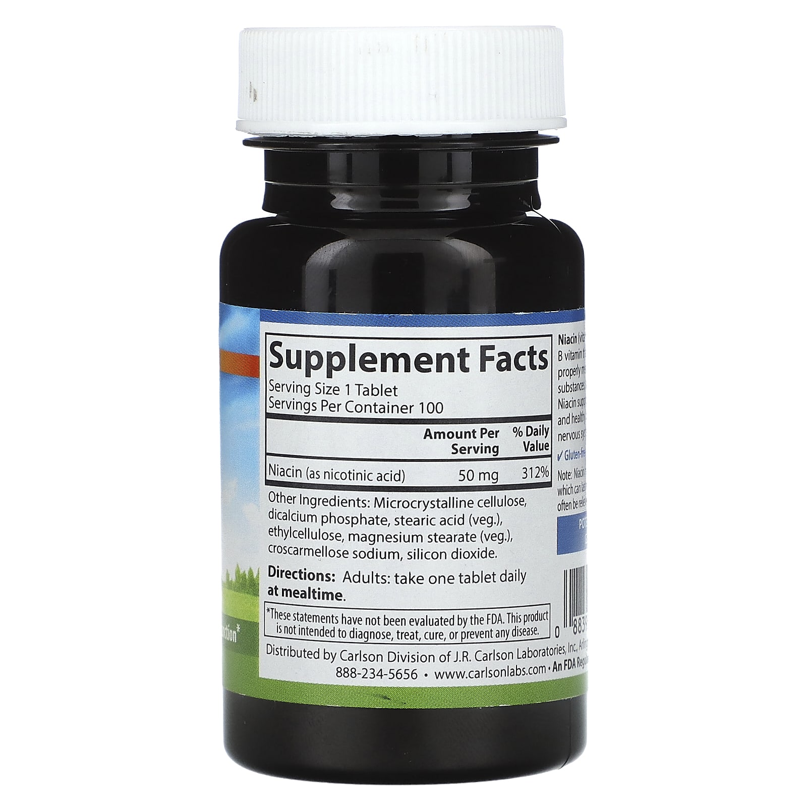 *Some information on the Carlson, Niacin, 50 mg , 100 Tabletslabel may be missing, or it may have been written incorrectly. We work hard to keep the information accurate & up to date. Please let us know if you discover any errors.