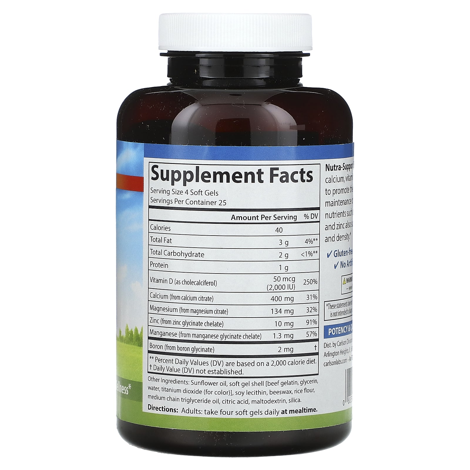 *Some information on the Carlson, Nutra-Support, Bone, 100 Soft Gelslabel may be missing, or it may have been written incorrectly. We work hard to keep the information accurate & up to date. Please let us know if you discover any errors.