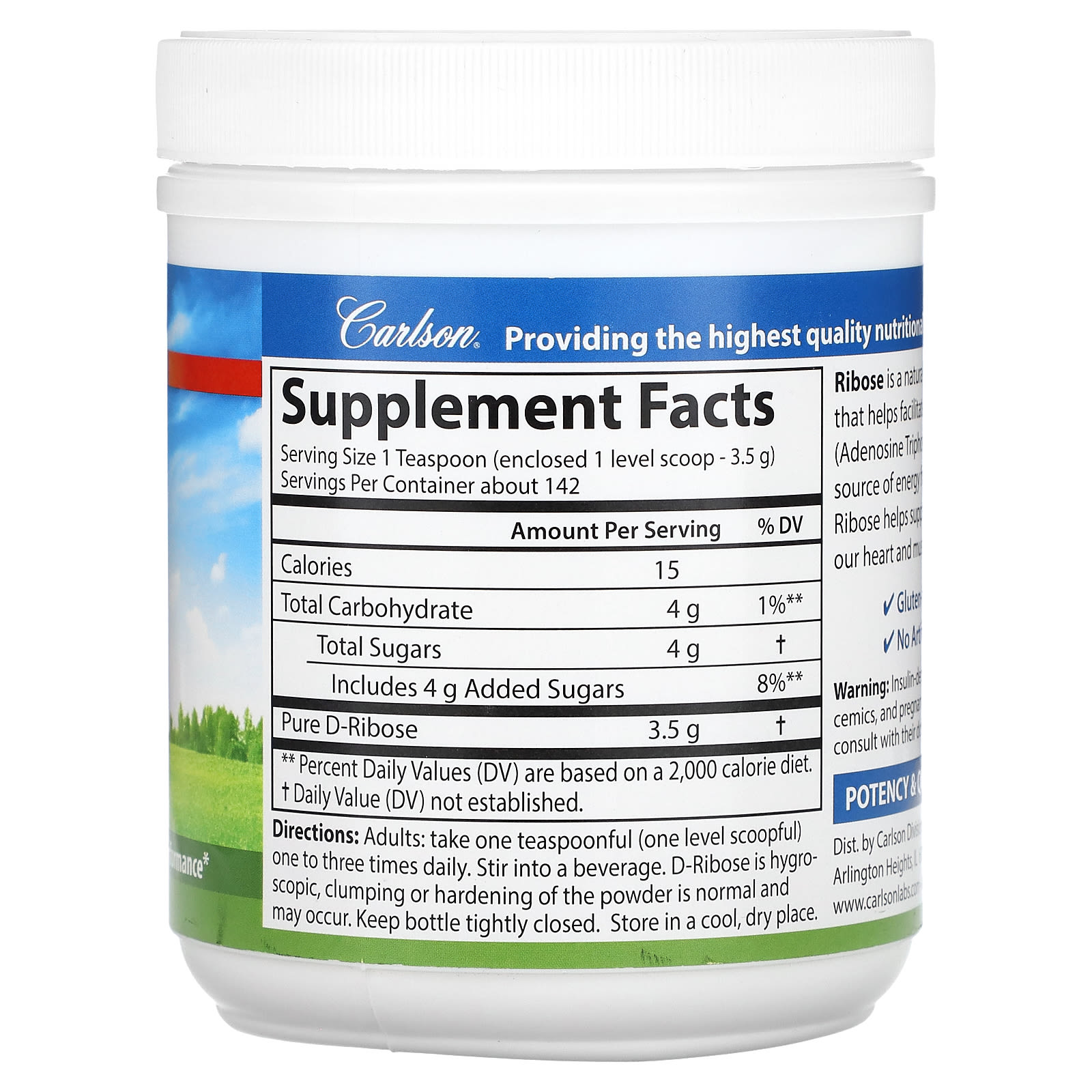 *Some information on the Carlson, Ribose, 17.6 oz (500 g)label may be missing, or it may have been written incorrectly. We work hard to keep the information accurate & up to date. Please let us know if you discover any errors.