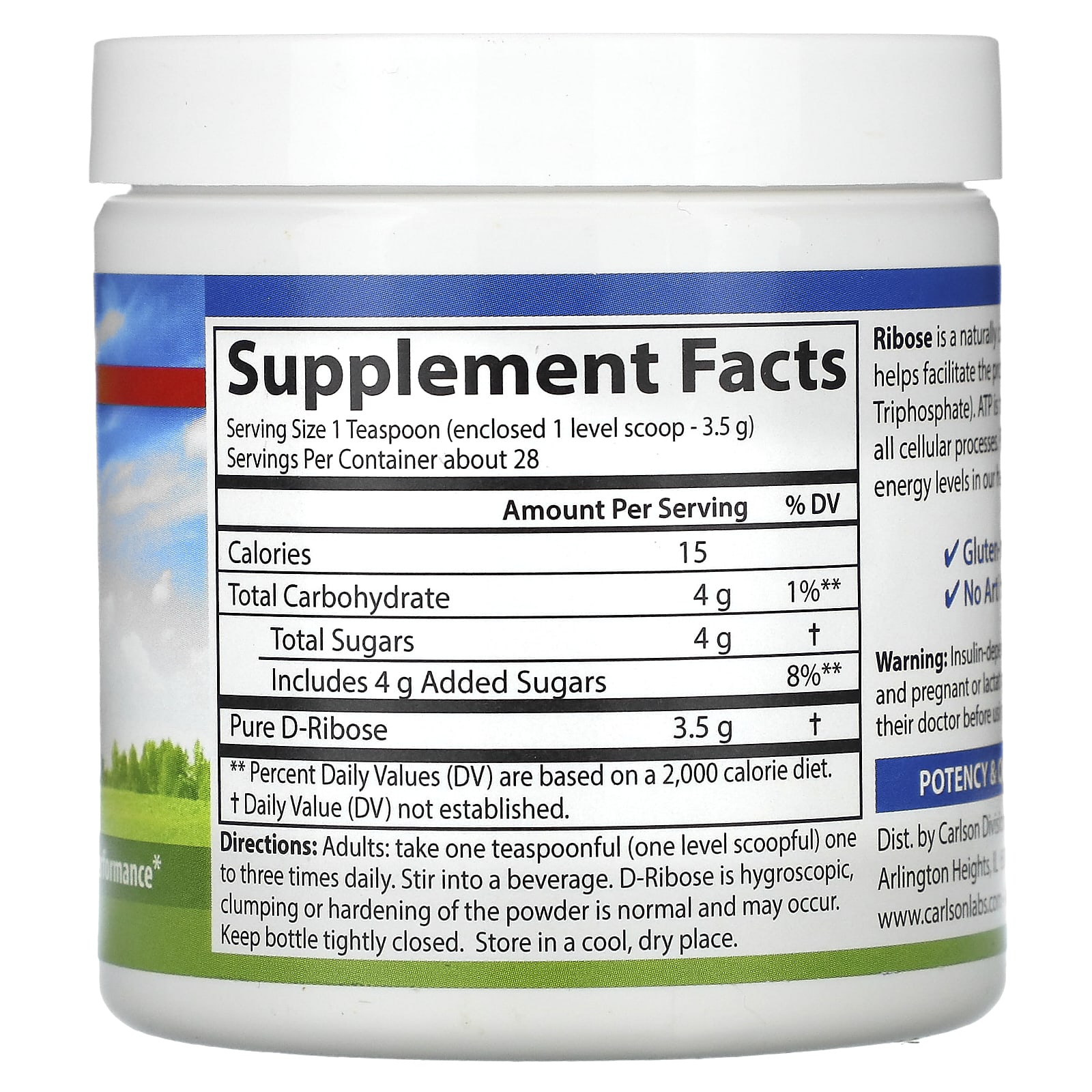 *Some information on the Carlson, Ribose, 3.53 oz (100 g)label may be missing, or it may have been written incorrectly. We work hard to keep the information accurate & up to date. Please let us know if you discover any errors.