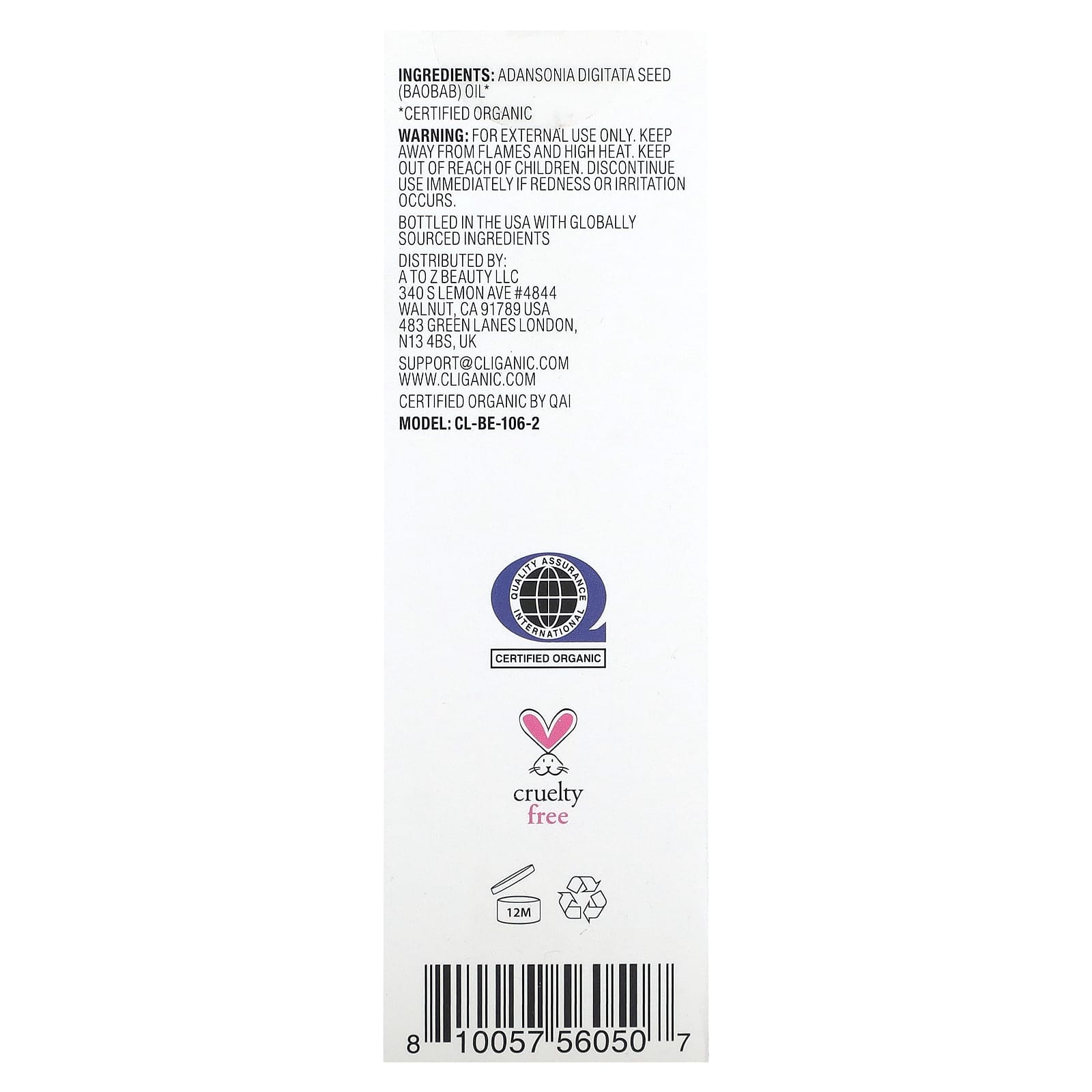 *Some information on the Cliganic, 100% Pure & Natural, Baobab Oil, 2 fl oz (60 ml)label may be missing, or it may have been written incorrectly. We work hard to keep the information accurate & up to date. Please let us know if you discover any errors.