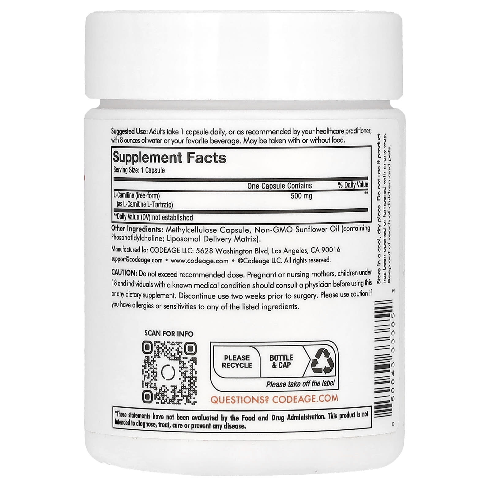 *Some information on the Codeage, Liposomal L-Carnitine+, 90 Capsuleslabel may be missing, or it may have been written incorrectly. We work hard to keep the information accurate & up to date. Please let us know if you discover any errors.