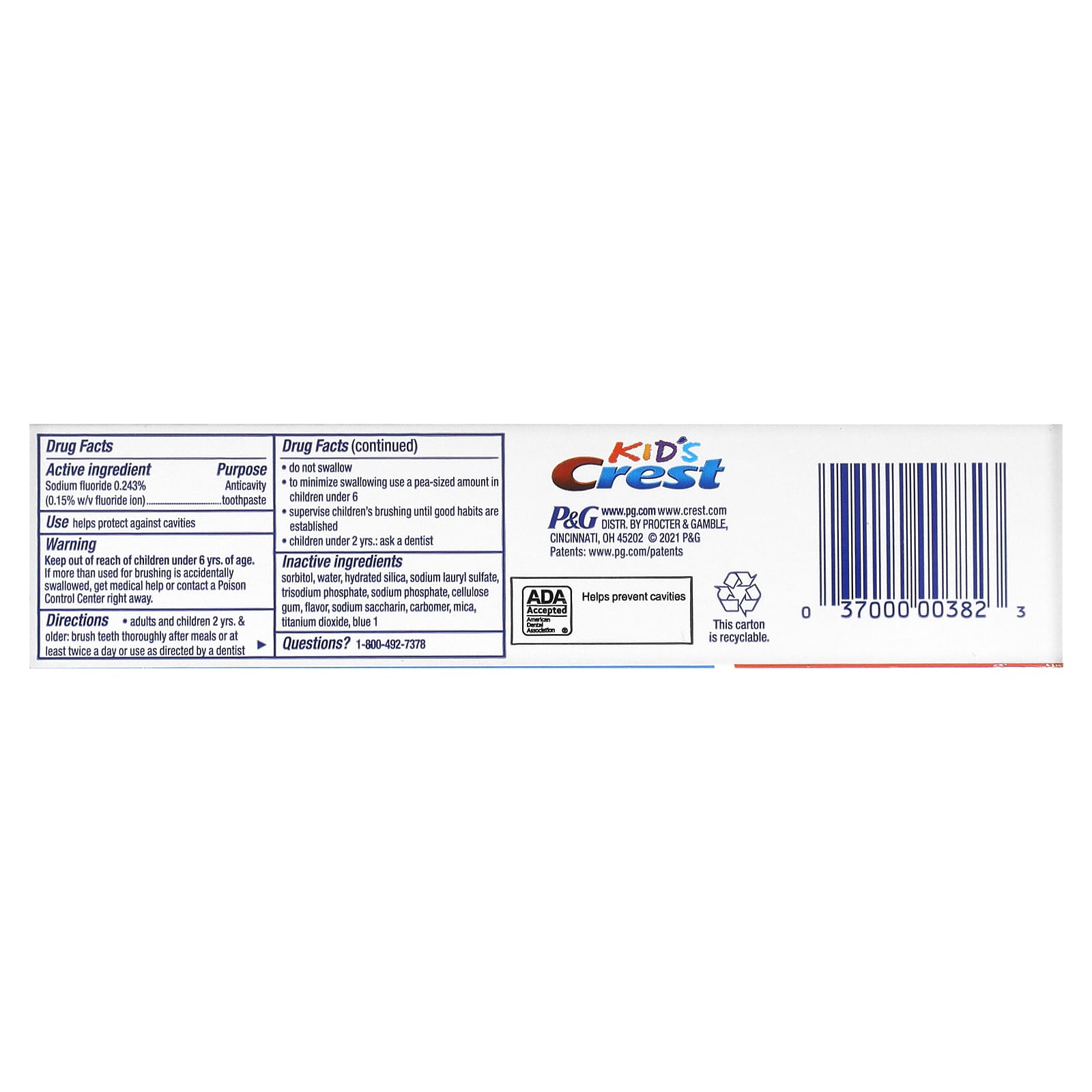 *Some information on the Crest, Kids, Fluoride Anticavity Toothpaste, Sparkle Fun, 4.6 oz (130 g)label may be missing, or it may have been written incorrectly. We work hard to keep the information accurate & up to date. Please let us know if you discover any errors.