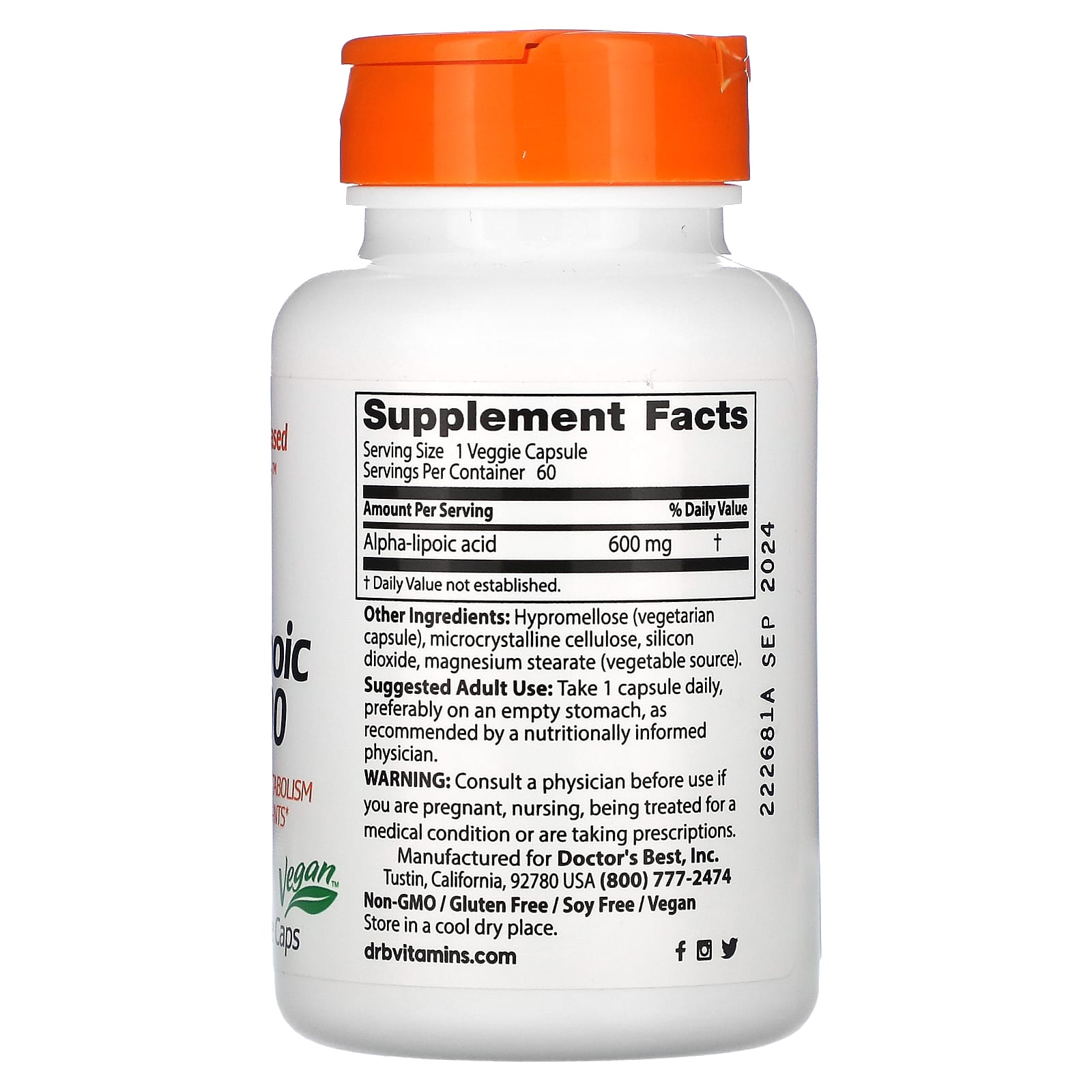 *Some information on the Doctor's Best, Alpha-Lipoic Acid 600, 600 mg, 60 Veggie Capslabel may be missing, or it may have been written incorrectly. We work hard to keep the information accurate & up to date. Please let us know if you discover any errors.