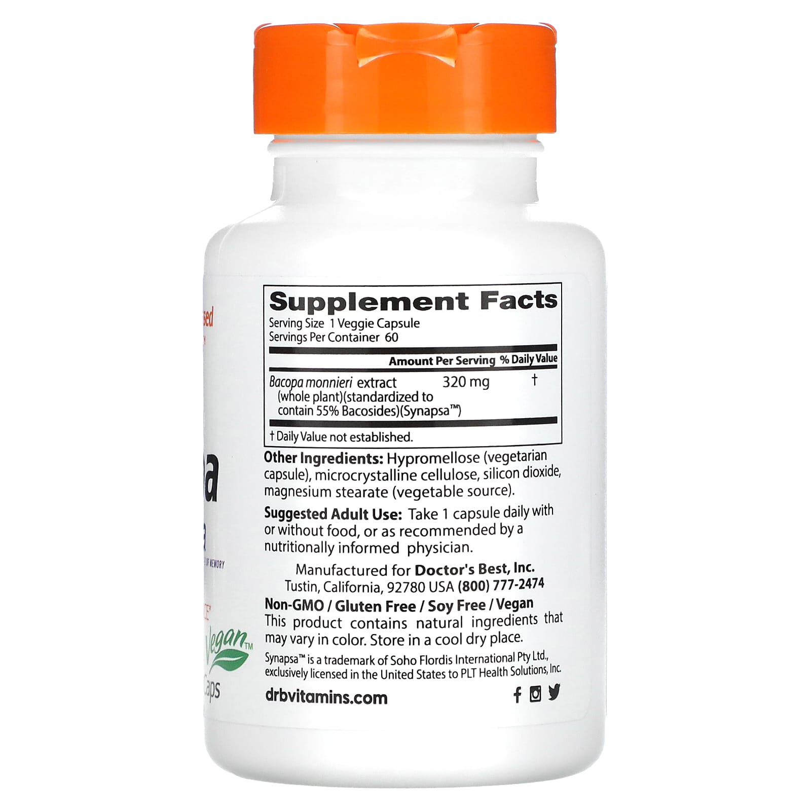 *Some information on the Doctor's Best, Bacopa with Synapsa, 320 mg, 60 Veggie Capslabel may be missing, or it may have been written incorrectly. We work hard to keep the information accurate & up to date. Please let us know if you discover any errors.