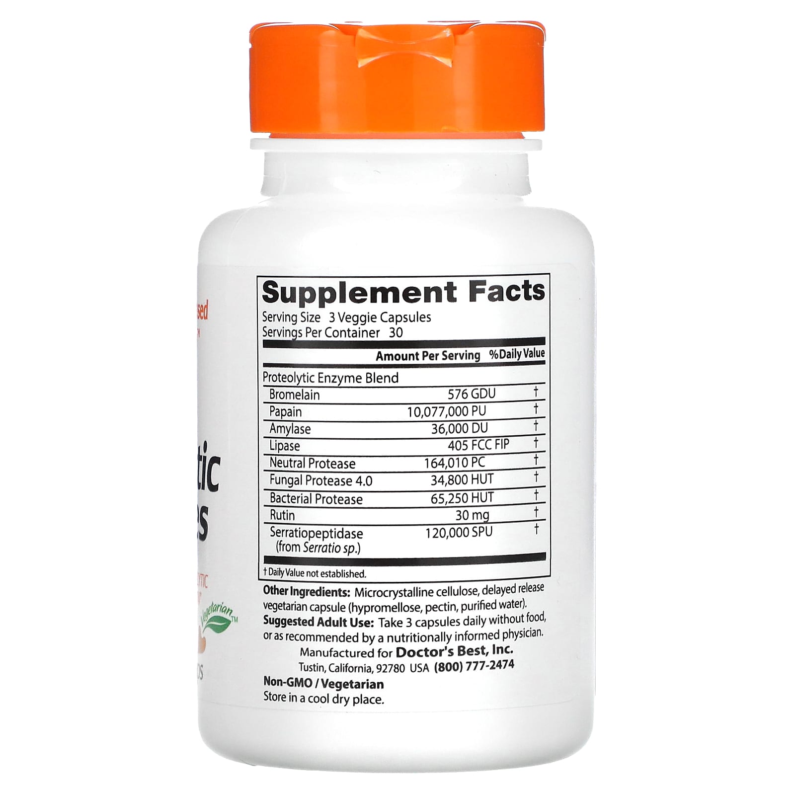 *Some information on the Doctor's Best, Proteolytic Enzymes, 90 Delayed Release Veggie Capslabel may be missing, or it may have been written incorrectly. We work hard to keep the information accurate & up to date. Please let us know if you discover any errors.