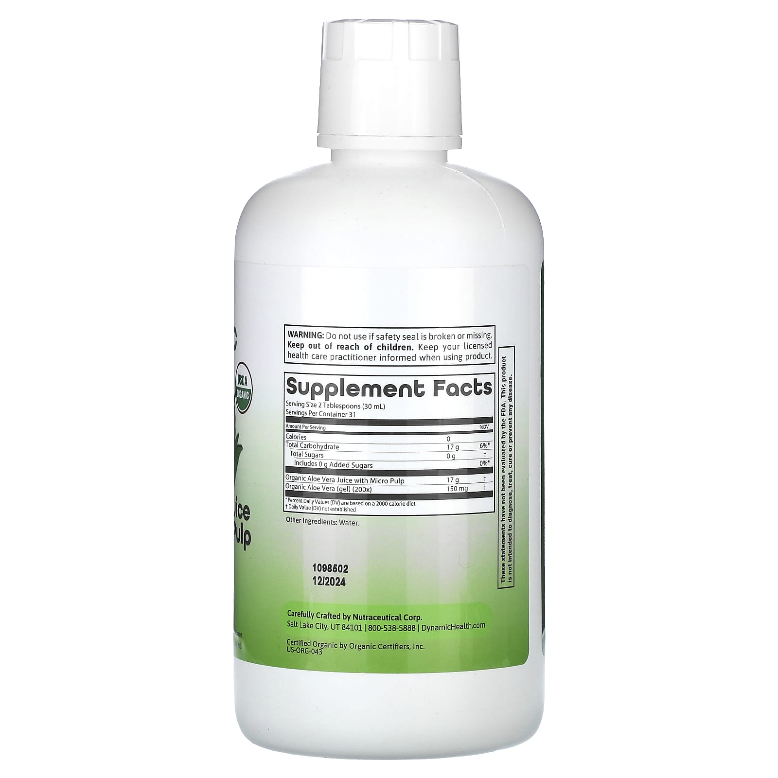 *Some information on the Dynamic Health, Aloe Vera Juice with Micro Pulp, 32 fl oz (946 ml)label may be missing, or it may have been written incorrectly. We work hard to keep the information accurate & up to date. Please let us know if you discover any errors.