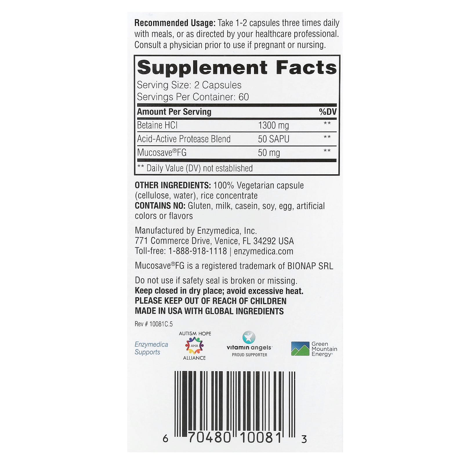 *Some information on the Enzymedica, Betaine HCl, 120 Capsuleslabel may be missing, or it may have been written incorrectly. We work hard to keep the information accurate & up to date. Please let us know if you discover any errors.