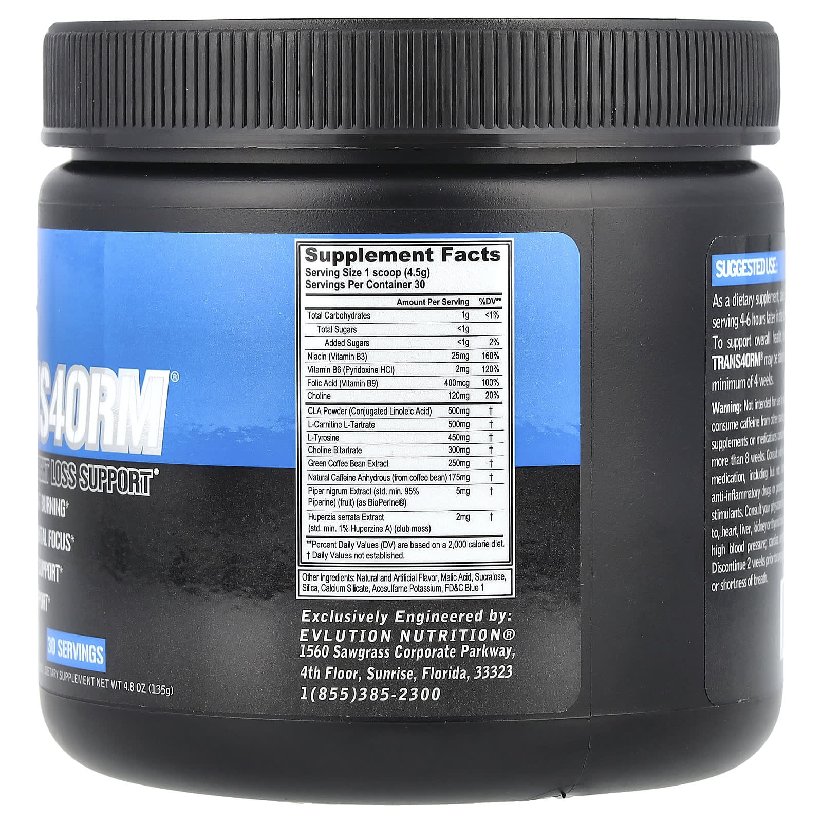 *Some information on the EVLution Nutrition, Trans4orm®, Energized Weight Loss Support, Blue Raz, 4.8 oz (135 g)label may be missing, or it may have been written incorrectly. We work hard to keep the information accurate & up to date. Please let us know if you discover any errors.