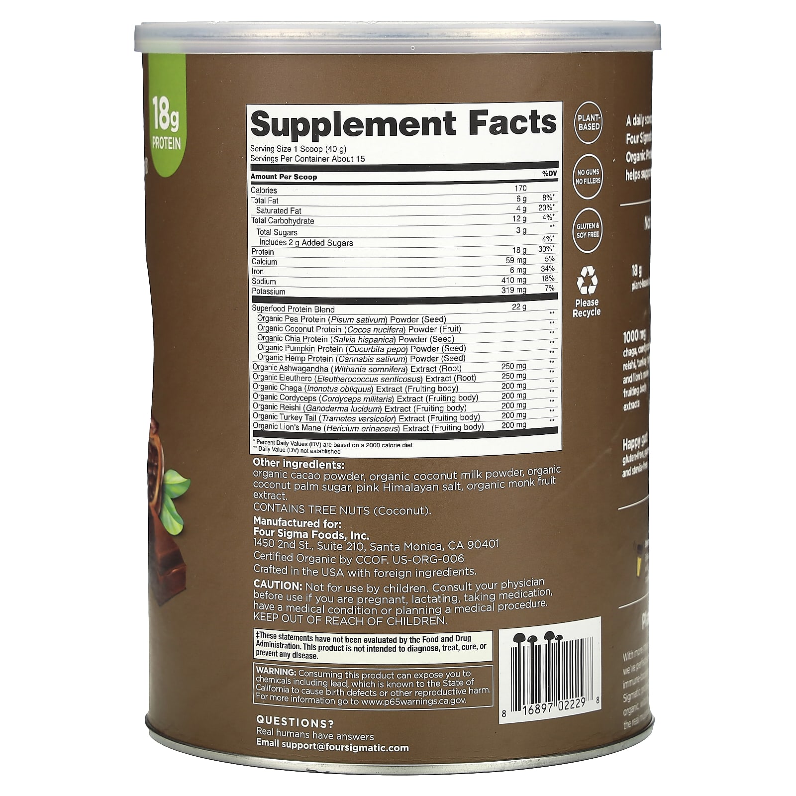*Some information on the Four Sigmatic, Plant-Based Organic Protein with Mushrooms & Adaptogens, Creamy Cacao, 1.32 lbs (600 g)label may be missing, or it may have been written incorrectly. We work hard to keep the information accurate & up to date. Please let us know if you discover any errors.