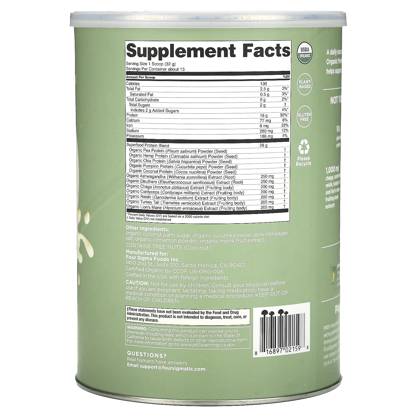 *Some information on the Four Sigmatic, Plant-Based Organic Protein with Mushrooms & Adaptogens , Unflavored, 1.06 lb 16.9 oz (480 g)label may be missing, or it may have been written incorrectly. We work hard to keep the information accurate & up to date. Please let us know if you discover any errors.