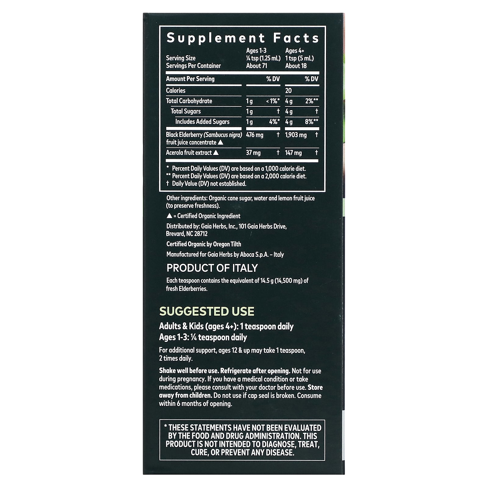 *Some information on the Gaia Herbs, Black Elderberry Syrup, Immune Support, 3 fl oz (89 ml)label may be missing, or it may have been written incorrectly. We work hard to keep the information accurate & up to date. Please let us know if you discover any errors.