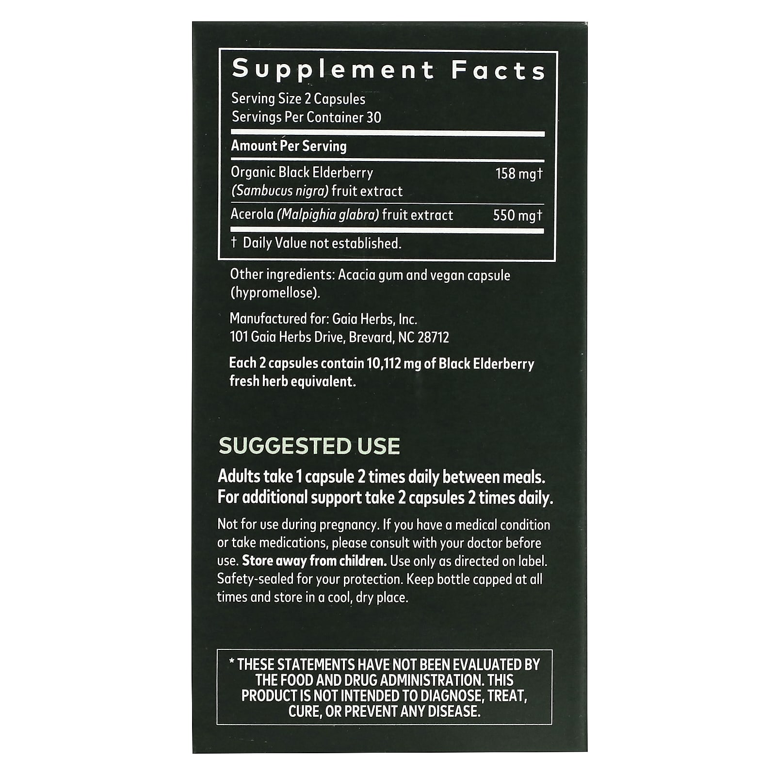 *Some information on the Gaia Herbs, Black Elderberry with Acerola Fruit, 60 Vegan Capsuleslabel may be missing, or it may have been written incorrectly. We work hard to keep the information accurate & up to date. Please let us know if you discover any errors.