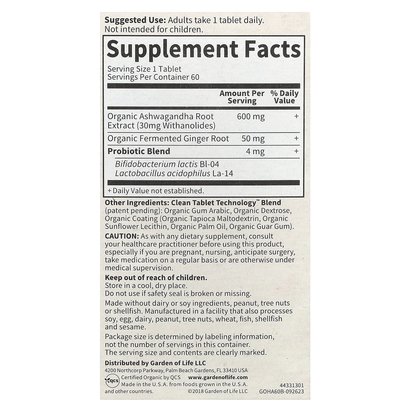 *Some information on the Garden of Life, Organics, Ashwagandha, 60 Vegan Tabletslabel may be missing, or it may have been written incorrectly. We work hard to keep the information accurate & up to date. Please let us know if you discover any errors.