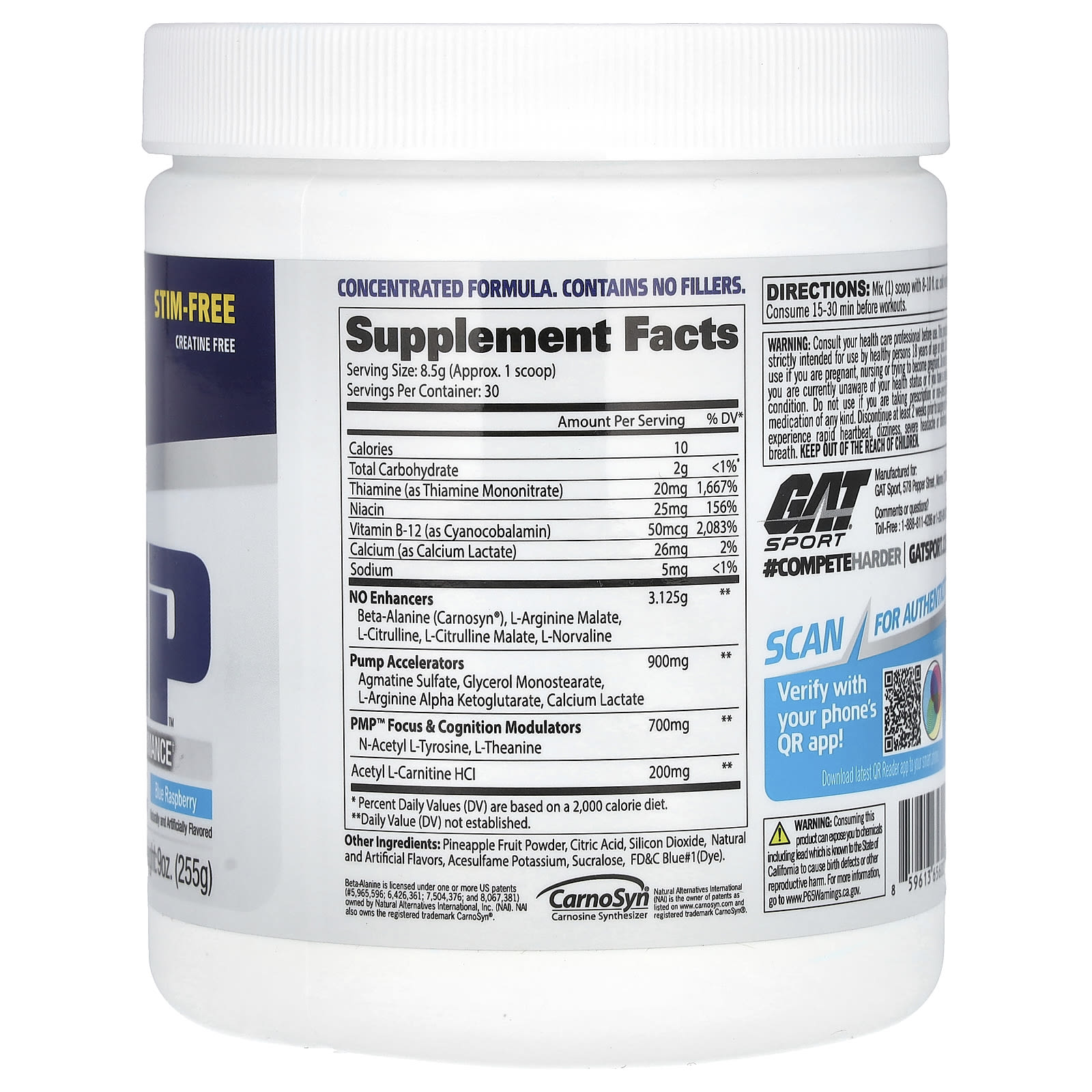 *Some information on the GAT, Stim-Free PMP, Peak Muscle Performance, Blue Raspberry, 9 oz (255 g)label may be missing, or it may have been written incorrectly. We work hard to keep the information accurate & up to date. Please let us know if you discover any errors.