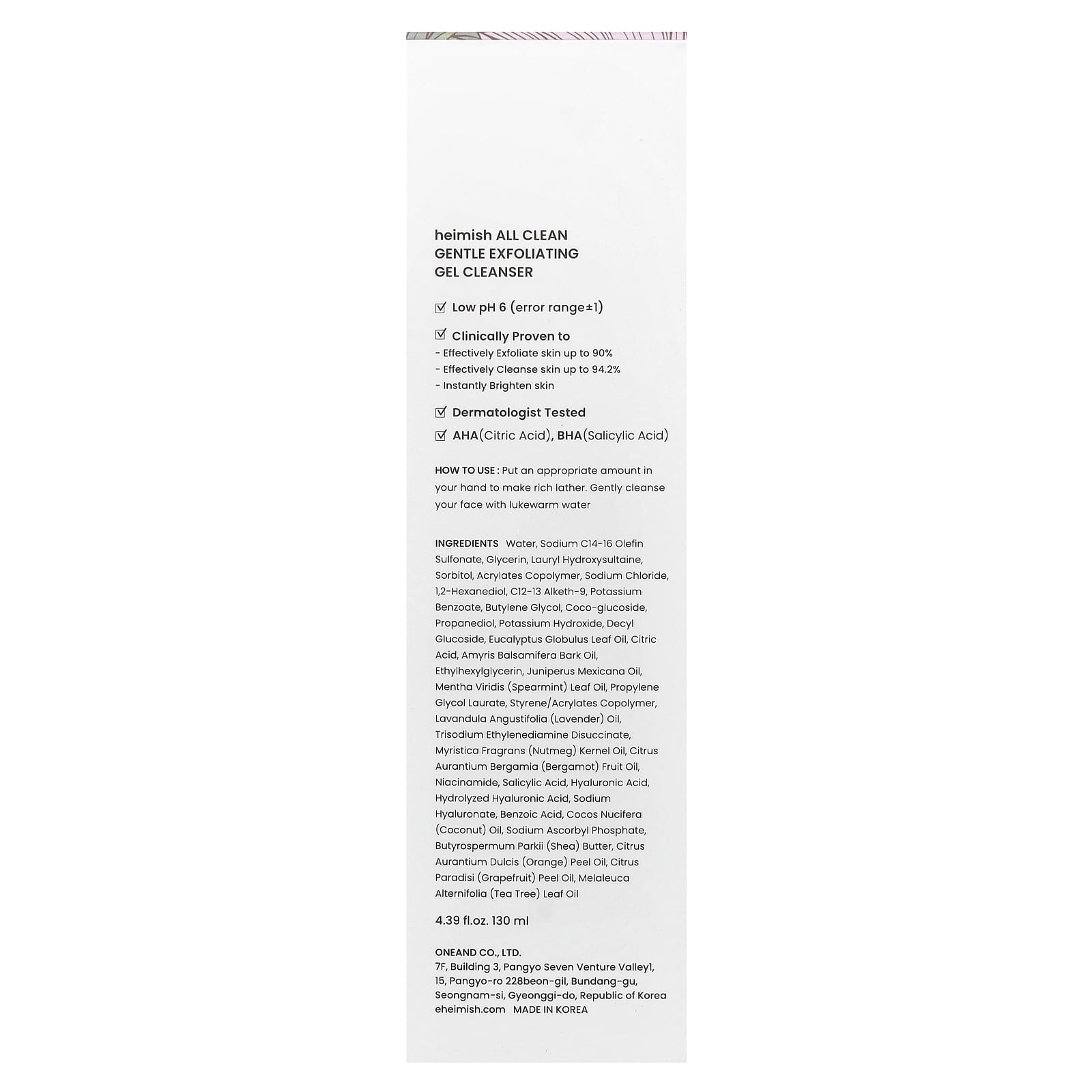 *Some information on the Heimish, All Clean, Gentle Exfoliating Gel Cleanser, AHA BHA, 4.39 fl oz (130 ml)label may be missing, or it may have been written incorrectly. We work hard to keep the information accurate & up to date. Please let us know if you discover any errors.