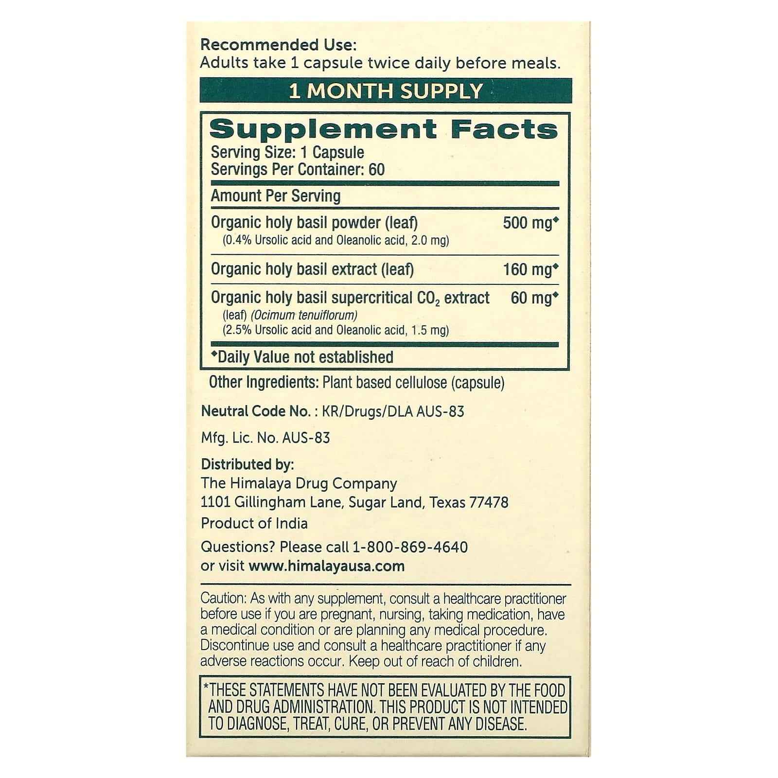 *Some information on the Himalaya, Holy Basil, 60 Vegetarian Capsuleslabel may be missing, or it may have been written incorrectly. We work hard to keep the information accurate & up to date. Please let us know if you discover any errors.