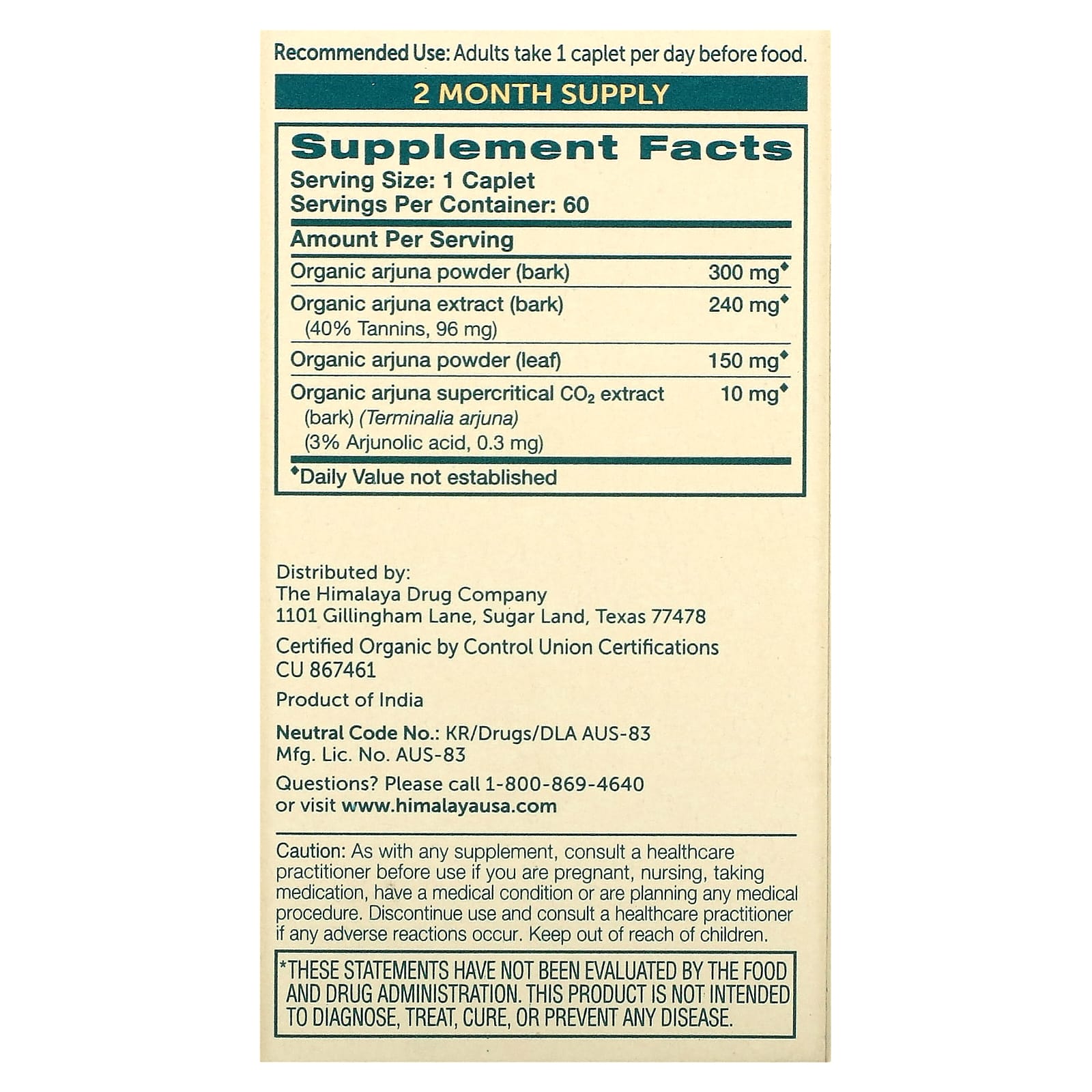*Some information on the Himalaya, Organic Arjuna, 60 Capletslabel may be missing, or it may have been written incorrectly. We work hard to keep the information accurate & up to date. Please let us know if you discover any errors.