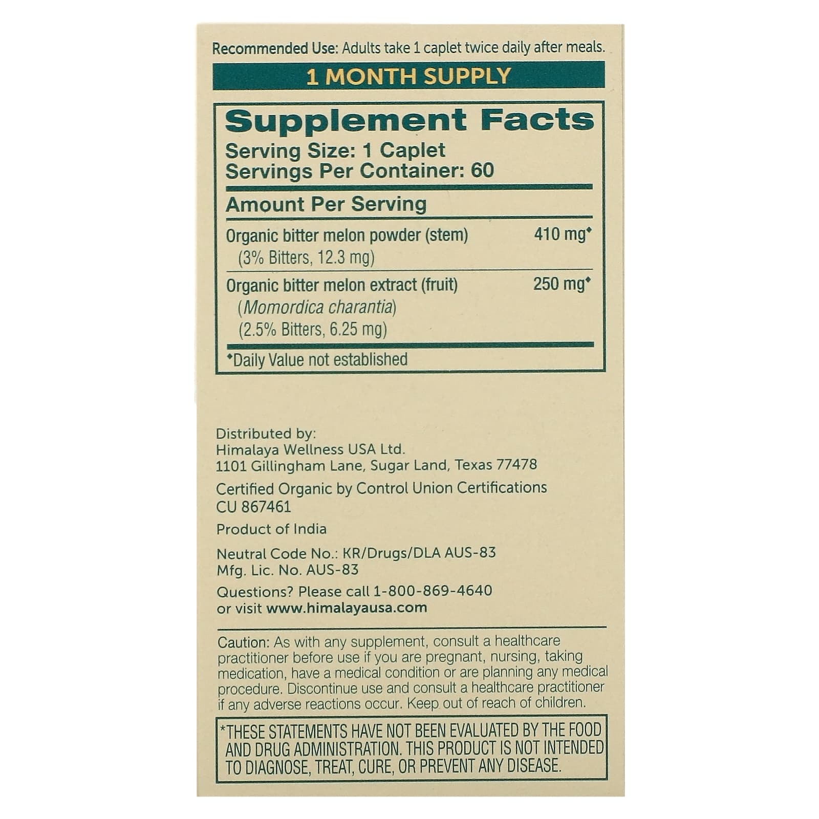 *Some information on the Himalaya, Organic Bitter Melon, 60 Capletslabel may be missing, or it may have been written incorrectly. We work hard to keep the information accurate & up to date. Please let us know if you discover any errors.