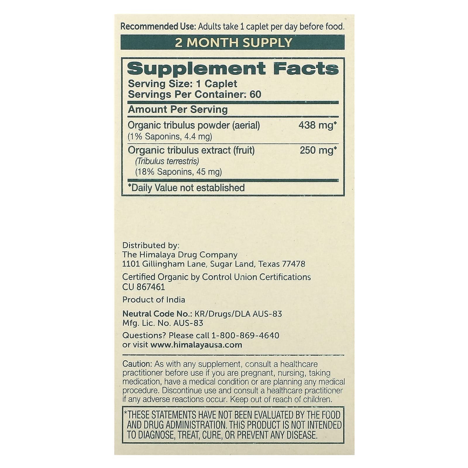 *Some information on the Himalaya, Organic Tribulus, 60 Capletslabel may be missing, or it may have been written incorrectly. We work hard to keep the information accurate & up to date. Please let us know if you discover any errors.