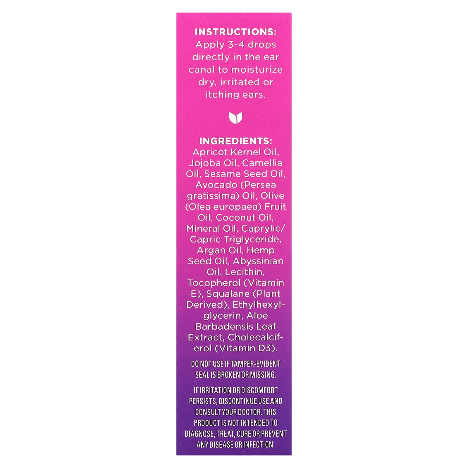 *Some information on the Hyland's Naturals, Dry Ear Relief Oil, Ages 2+, 0.5 fl oz (15 ml)label may be missing, or it may have been written incorrectly. We work hard to keep the information accurate & up to date. Please let us know if you discover any errors.