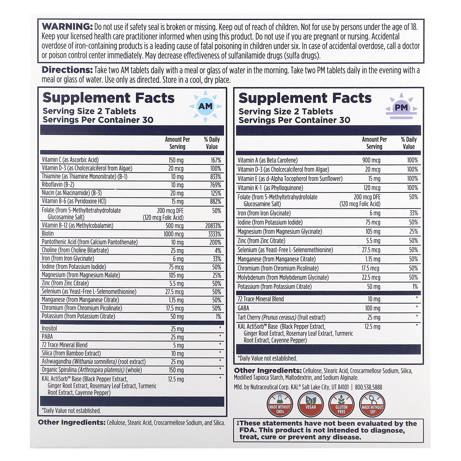 *Some information on the KAL, Women's Multivitamin, Morning & Evening, 2 Pack, 60 Tablets Eachlabel may be missing, or it may have been written incorrectly. We work hard to keep the information accurate & up to date. Please let us know if you discover any errors.