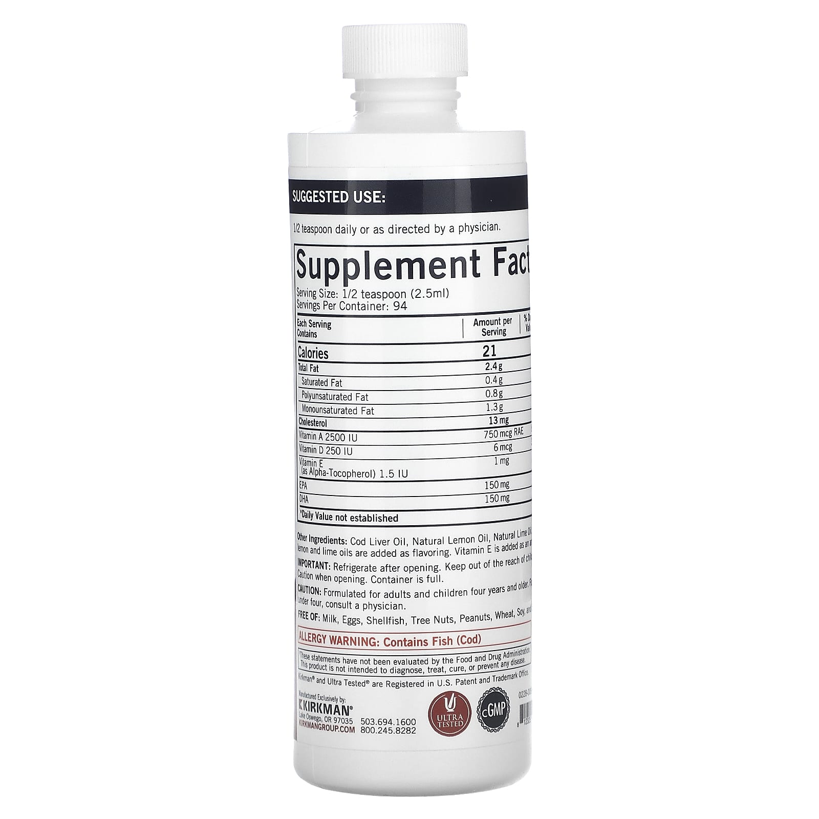 *Some information on the Kirkman Labs, Cod Liver Oil Liquid, Natural Lemon Lime, 8 fl oz (237 ml)label may be missing, or it may have been written incorrectly. We work hard to keep the information accurate & up to date. Please let us know if you discover any errors.