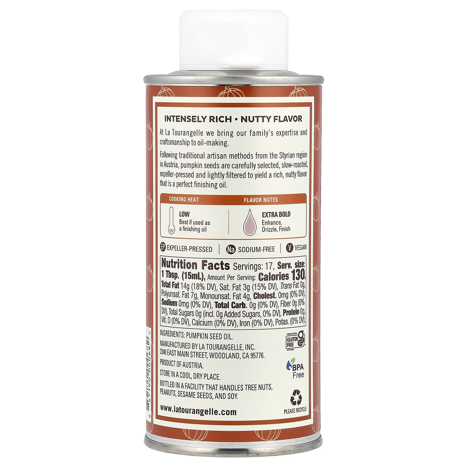 *Some information on the La Tourangelle, Toasted Pumpkin Seed Oil, 8.45 fl oz (250 ml)label may be missing, or it may have been written incorrectly. We work hard to keep the information accurate & up to date. Please let us know if you discover any errors.