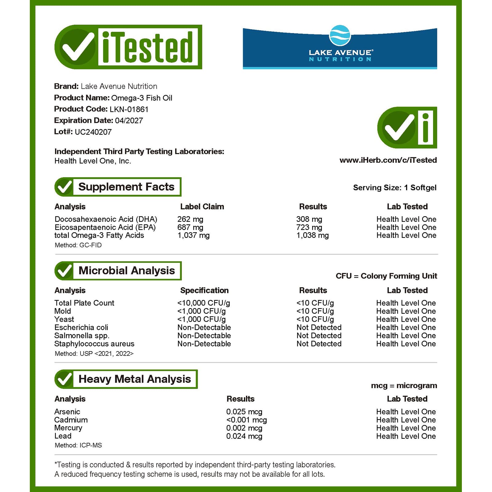 *Some information on the Lake Avenue Nutrition, Omega-3 Fish Oil, 1,250 mg, 30 Fish Gelatin Softgelslabel may be missing, or it may have been written incorrectly. We work hard to keep the information accurate & up to date. Please let us know if you discover any errors.