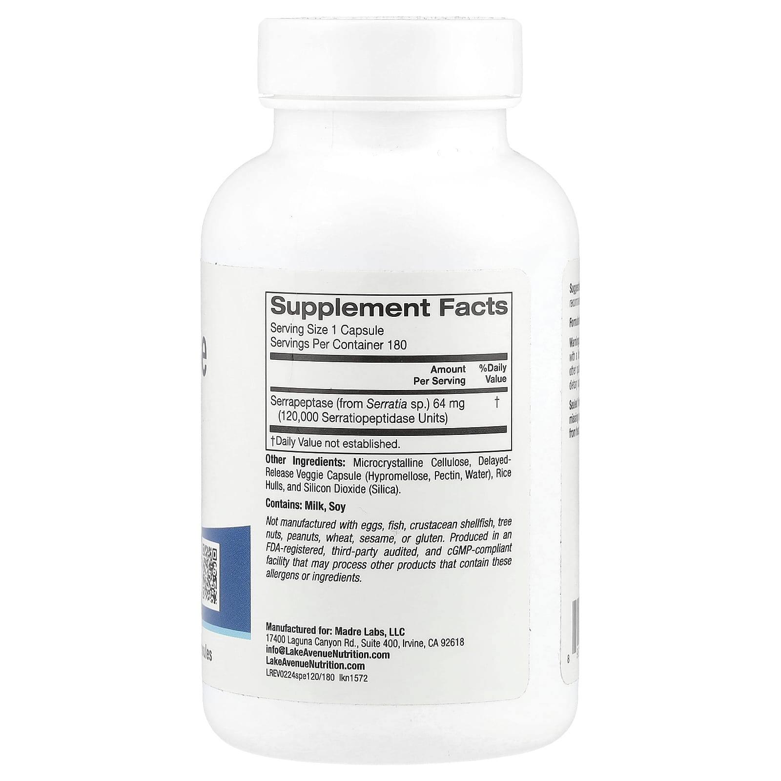*Some information on the Lake Avenue Nutrition, Serrapeptase, Proteolytic Enzyme, 120,000 SPUs, 180 Veggie Capsuleslabel may be missing, or it may have been written incorrectly. We work hard to keep the information accurate & up to date. Please let us know if you discover any errors.