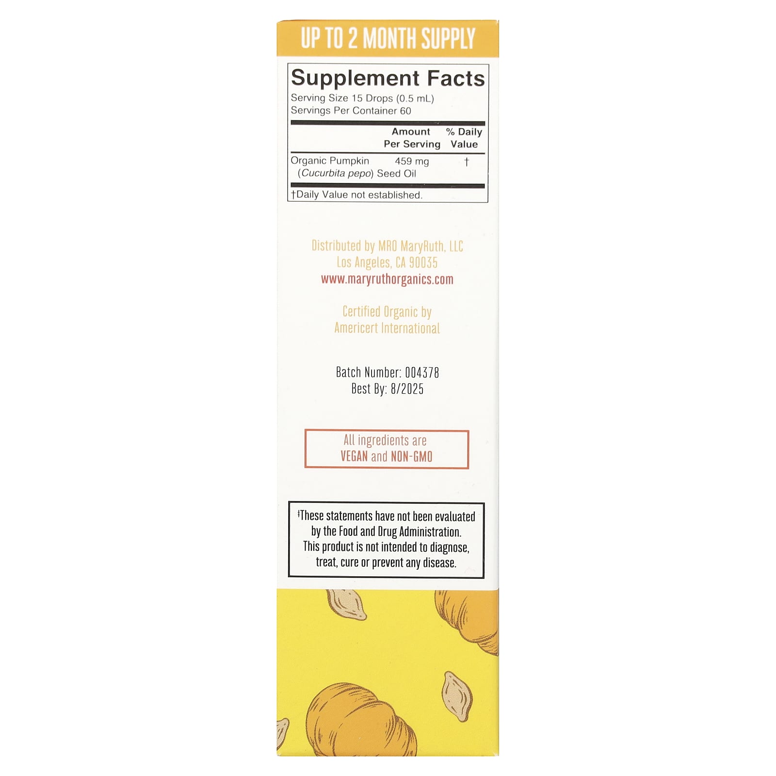 *Some information on the MaryRuth's, Organic Pumpkin Seed Oil Liquid Drops, Alcohol Free, 1 fl oz (30 ml)label may be missing, or it may have been written incorrectly. We work hard to keep the information accurate & up to date. Please let us know if you discover any errors.
