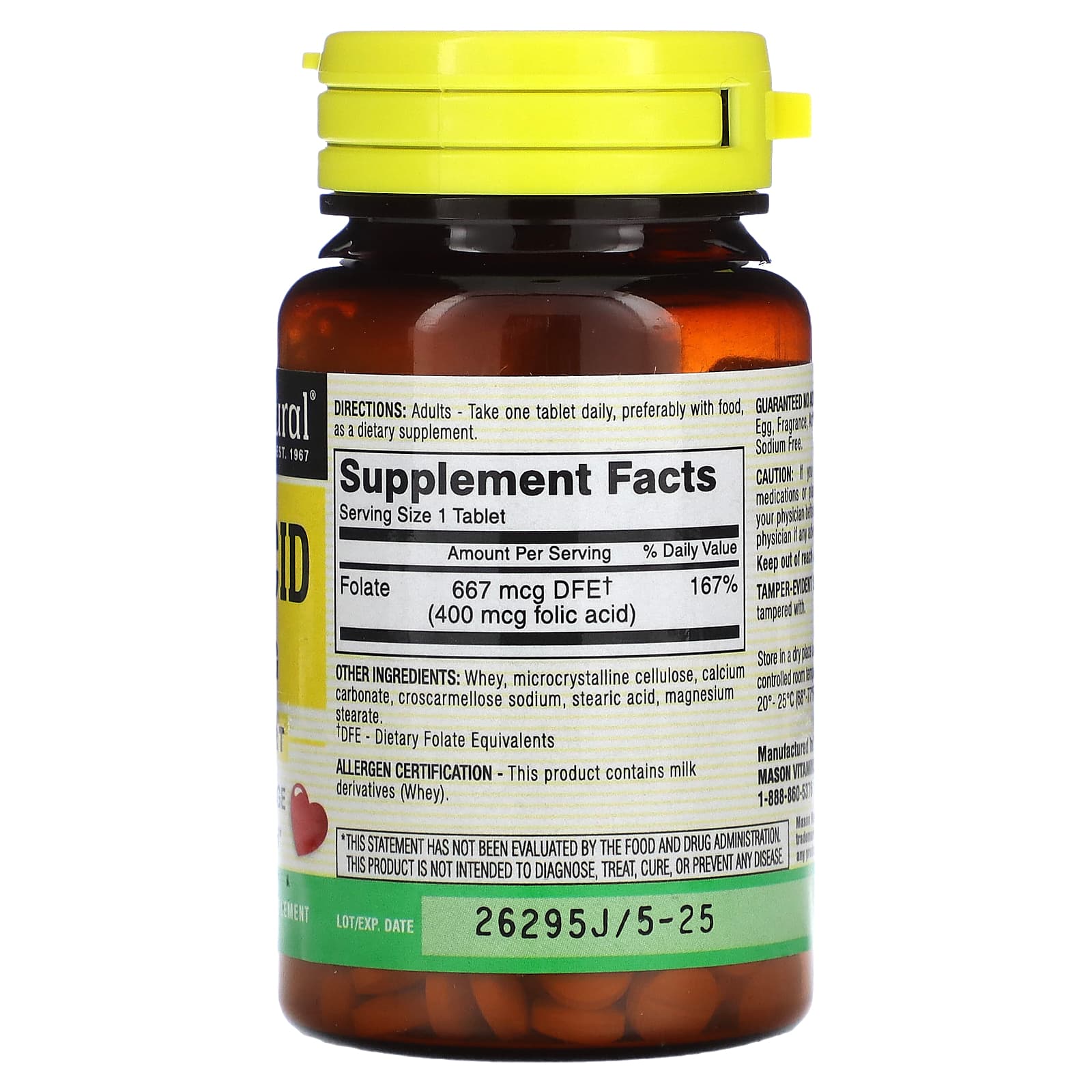*Some information on the Mason Natural, Folic Acid, 400 mcg, 100 Tabletslabel may be missing, or it may have been written incorrectly. We work hard to keep the information accurate & up to date. Please let us know if you discover any errors.