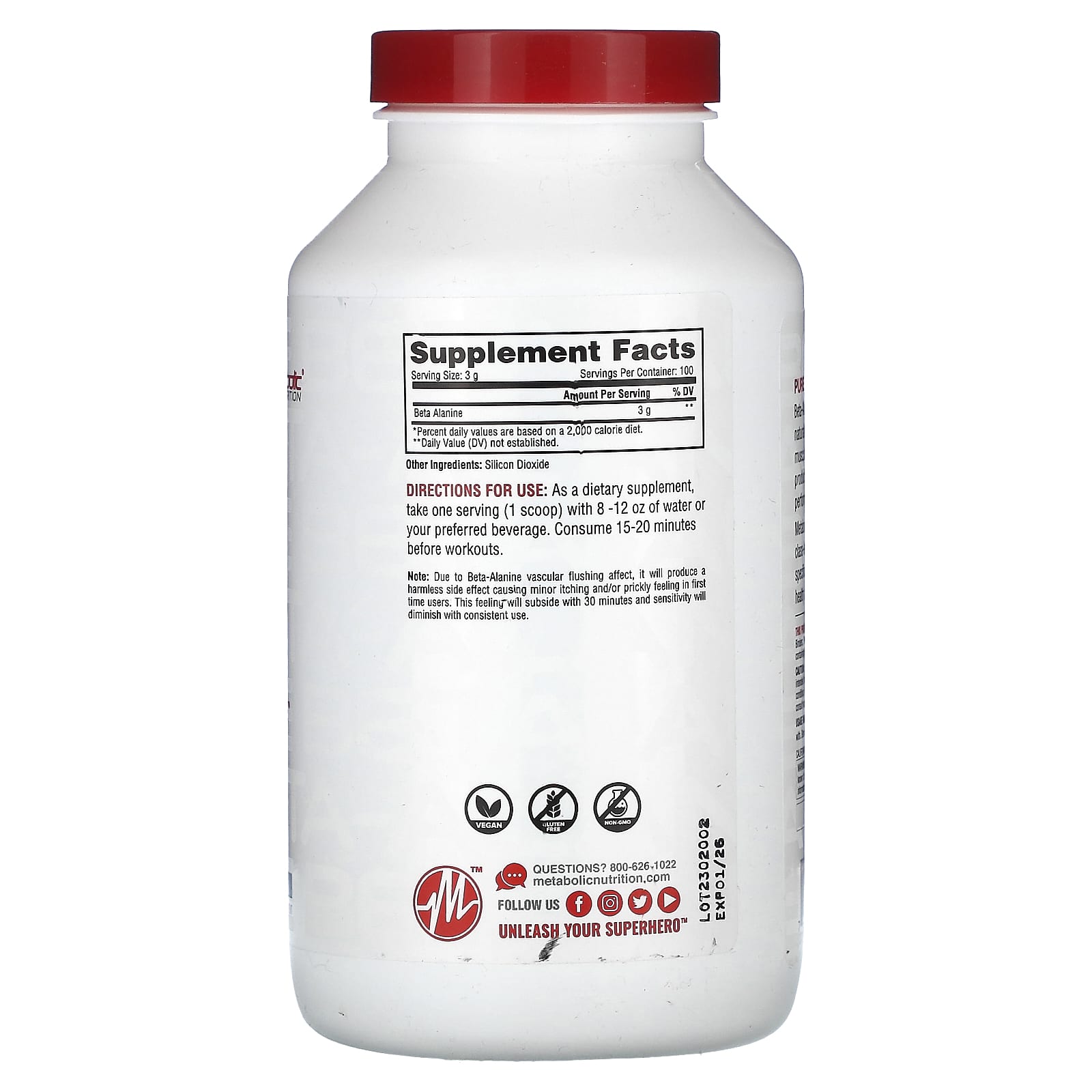 *Some information on the Metabolic Nutrition, Beta-Alanine, Unflavored , 10.58 oz (300 g)label may be missing, or it may have been written incorrectly. We work hard to keep the information accurate & up to date. Please let us know if you discover any errors.