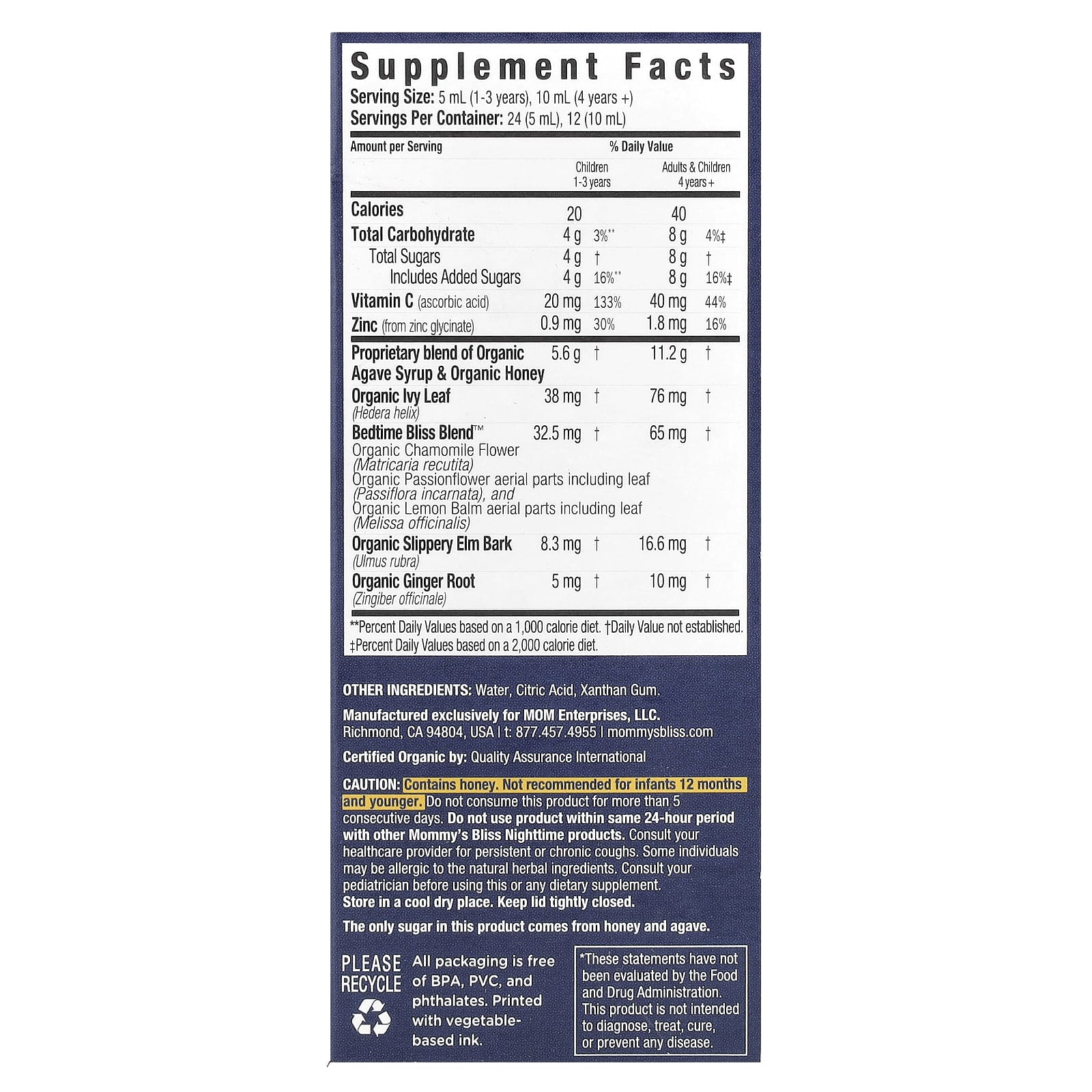 *Some information on the Mommy's Bliss, Kids, Organic Cough Syrup & Mucus, Night Time, 1-12 Yrs, 4 fl oz (120 ml)label may be missing, or it may have been written incorrectly. We work hard to keep the information accurate & up to date. Please let us know if you discover any errors.
