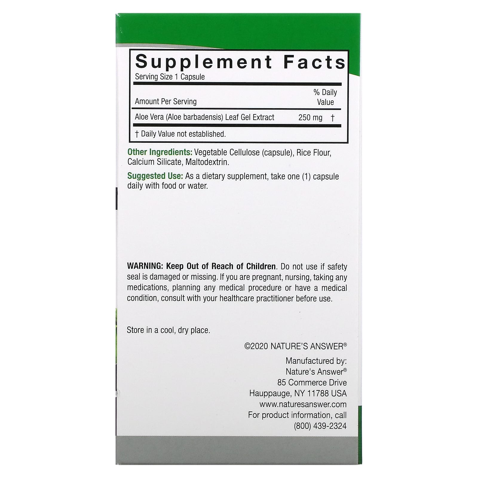 *Some information on the Nature's Answer, Aloe Vera Phytogel, 250 mg, 90 Vegetarian Capsuleslabel may be missing, or it may have been written incorrectly. We work hard to keep the information accurate & up to date. Please let us know if you discover any errors.