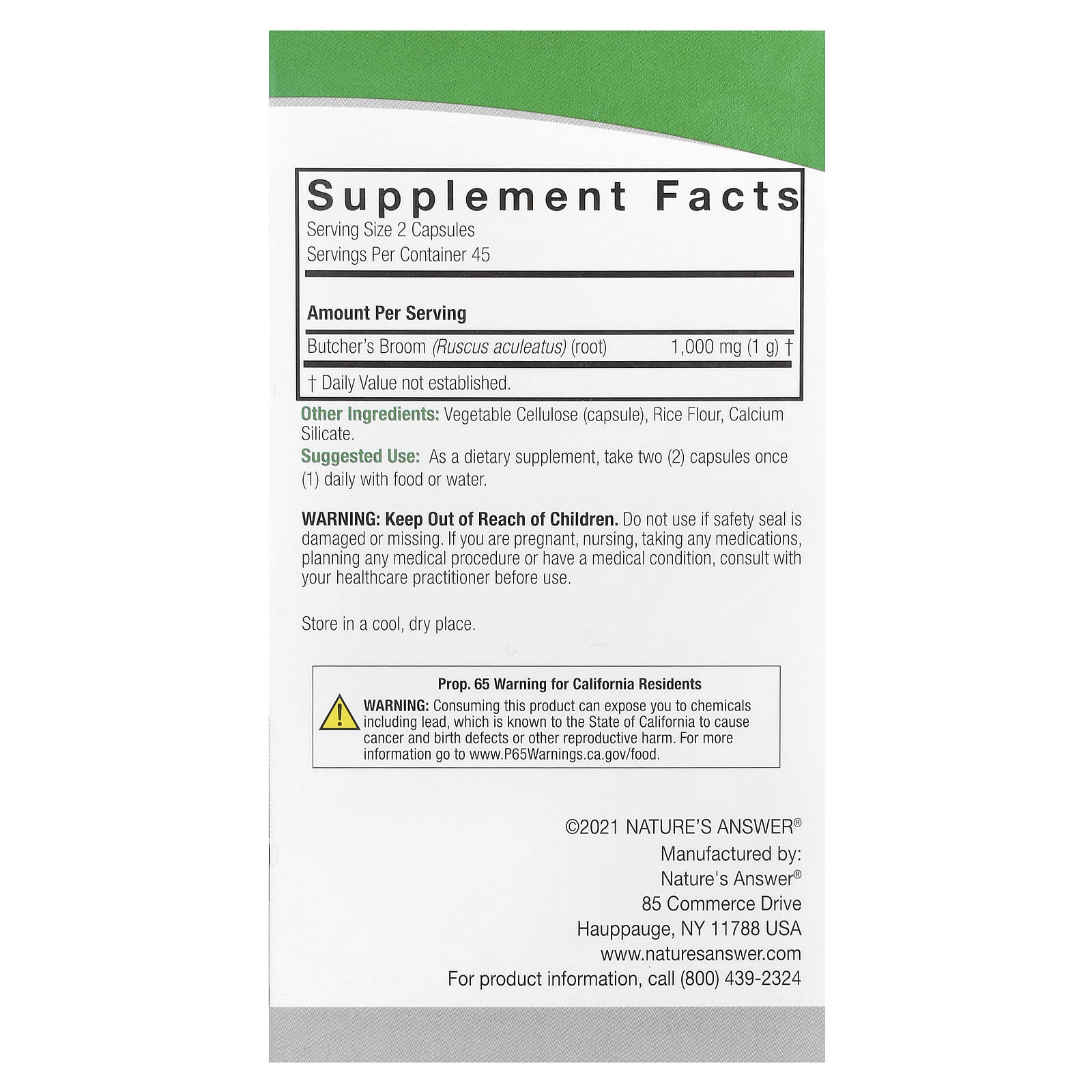 *Some information on the Nature's Answer, Butcher's Broom, 1,000 mg, 90 Vegetarian Capsules (500 mg per Capsule)label may be missing, or it may have been written incorrectly. We work hard to keep the information accurate & up to date. Please let us know if you discover any errors.