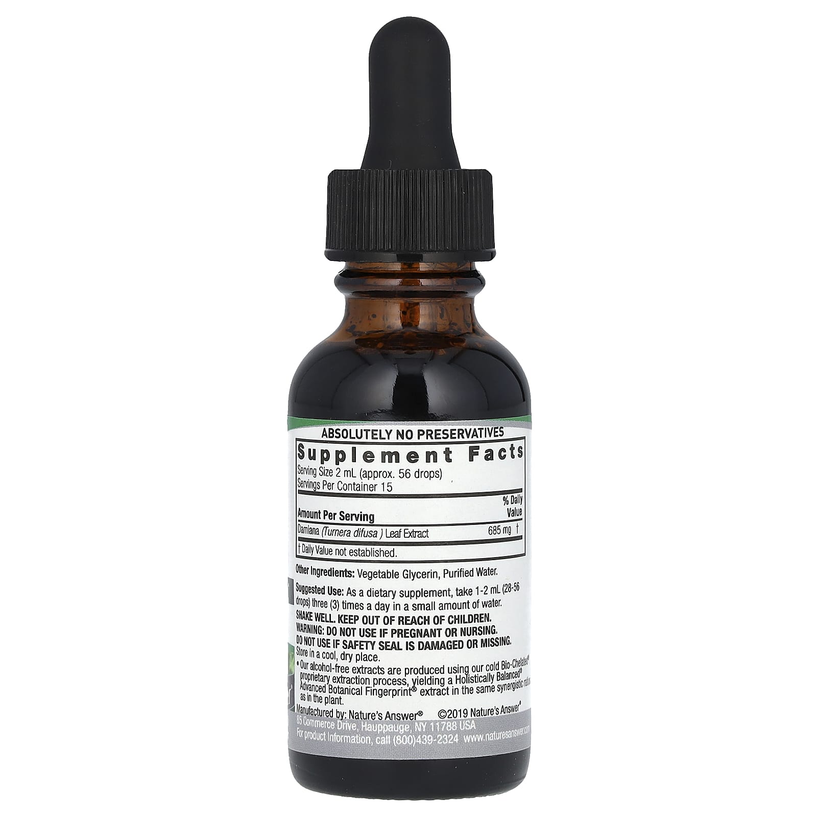 *Some information on the Nature's Answer, Damiana Extract, Alcohol-Free, 2,500 mg, 1 fl oz (30 ml)label may be missing, or it may have been written incorrectly. We work hard to keep the information accurate & up to date. Please let us know if you discover any errors.