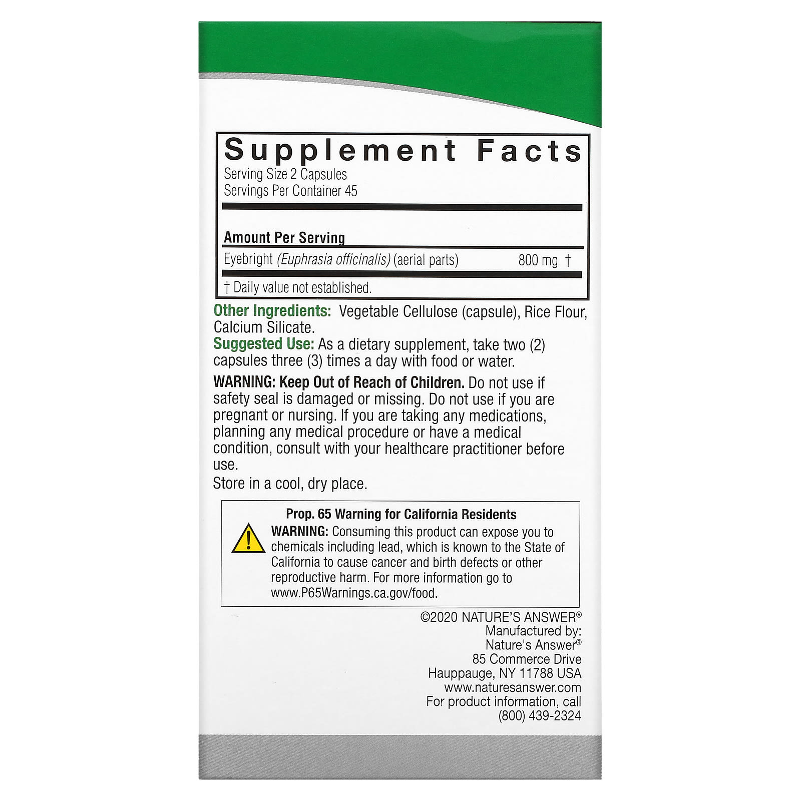 *Some information on the Nature's Answer, Eyebright, 800 mg, 90 Vegetarian Capsules (400 mg per Capsule)label may be missing, or it may have been written incorrectly. We work hard to keep the information accurate & up to date. Please let us know if you discover any errors.