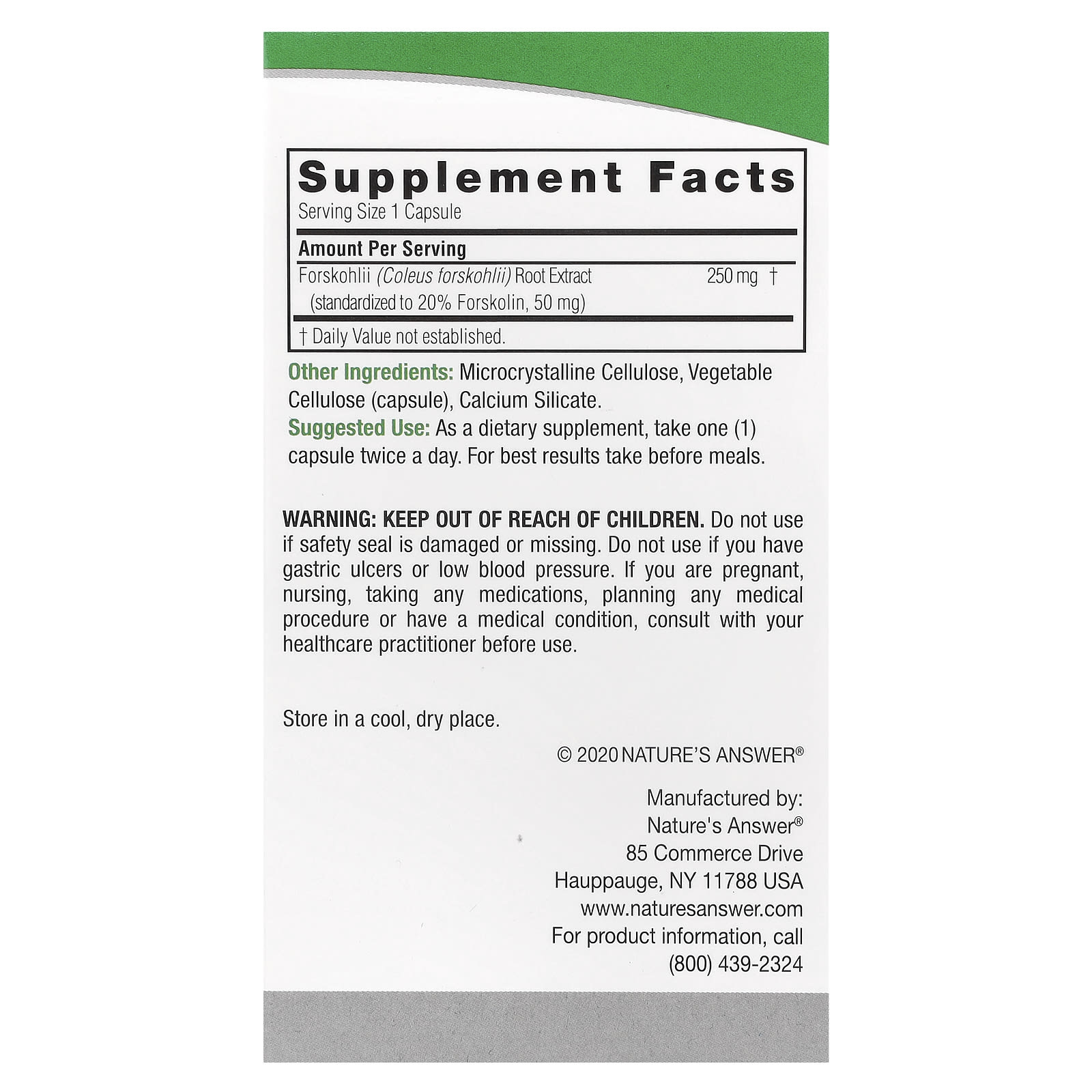 *Some information on the Nature's Answer, Forskohlii, 250 mg, 60 Vegetarian Capsuleslabel may be missing, or it may have been written incorrectly. We work hard to keep the information accurate & up to date. Please let us know if you discover any errors.