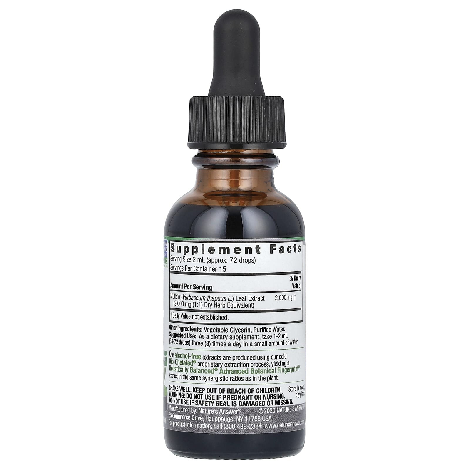 *Some information on the Nature's Answer, Mullein Leaf, Fluid Extract, Alcohol-Free , 2,000 mg, 1 fl oz (30 ml)label may be missing, or it may have been written incorrectly. We work hard to keep the information accurate & up to date. Please let us know if you discover any errors.