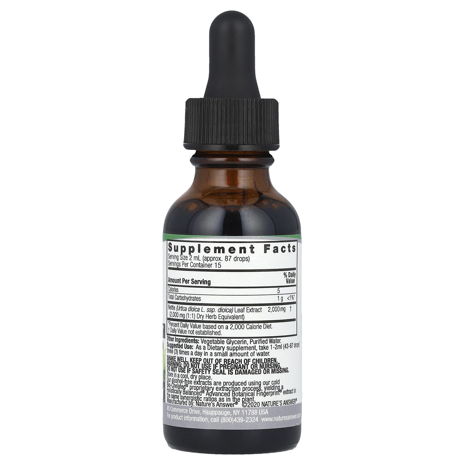 *Some information on the Nature's Answer, Nettle Extract, Alcohol-Free, 2,000 mg, 1 fl oz (30 ml)label may be missing, or it may have been written incorrectly. We work hard to keep the information accurate & up to date. Please let us know if you discover any errors.