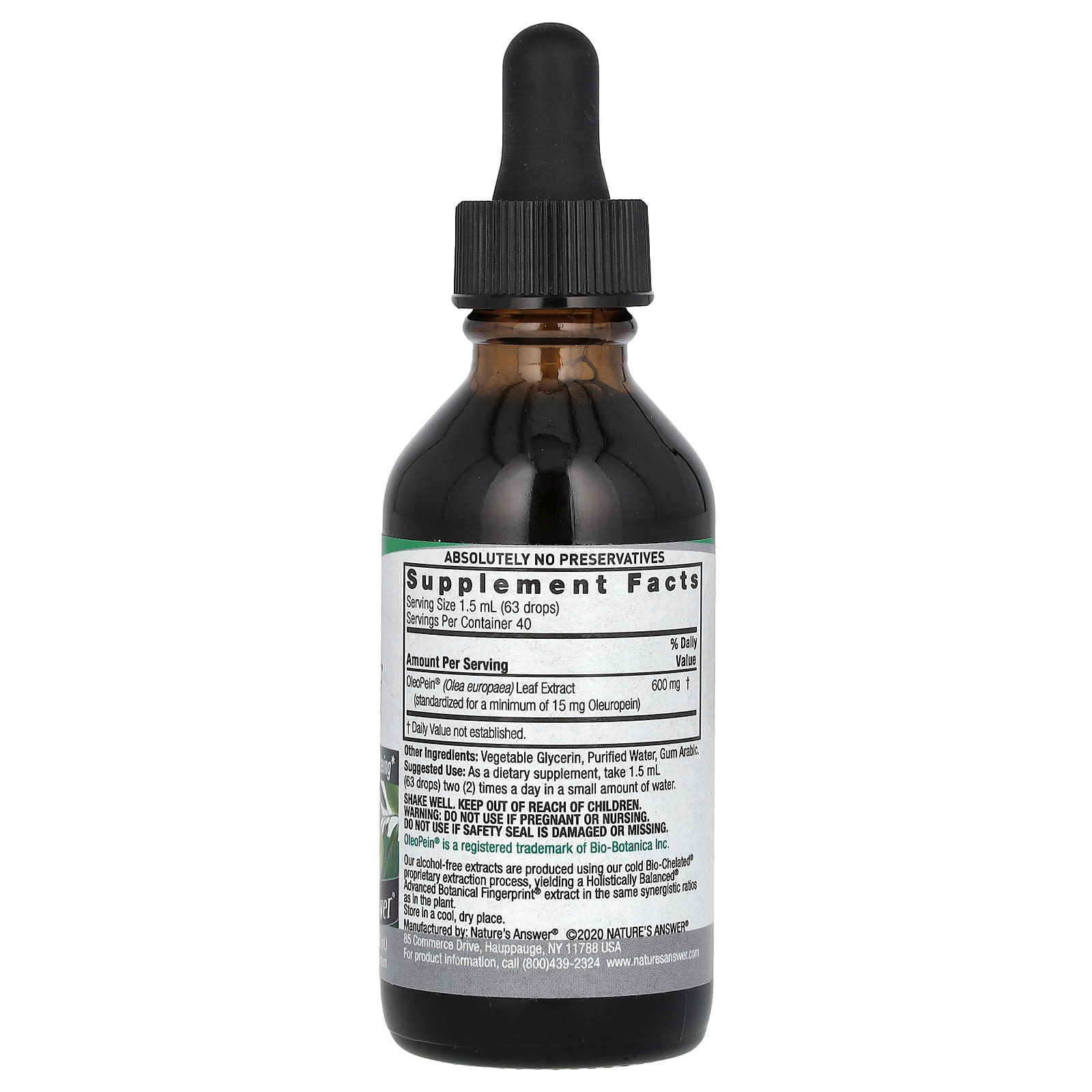 *Some information on the Nature's Answer, Olive Leaf Extract, Standardized, Alcohol-Free, 1,500 mg, 2 fl oz (60 ml)label may be missing, or it may have been written incorrectly. We work hard to keep the information accurate & up to date. Please let us know if you discover any errors.