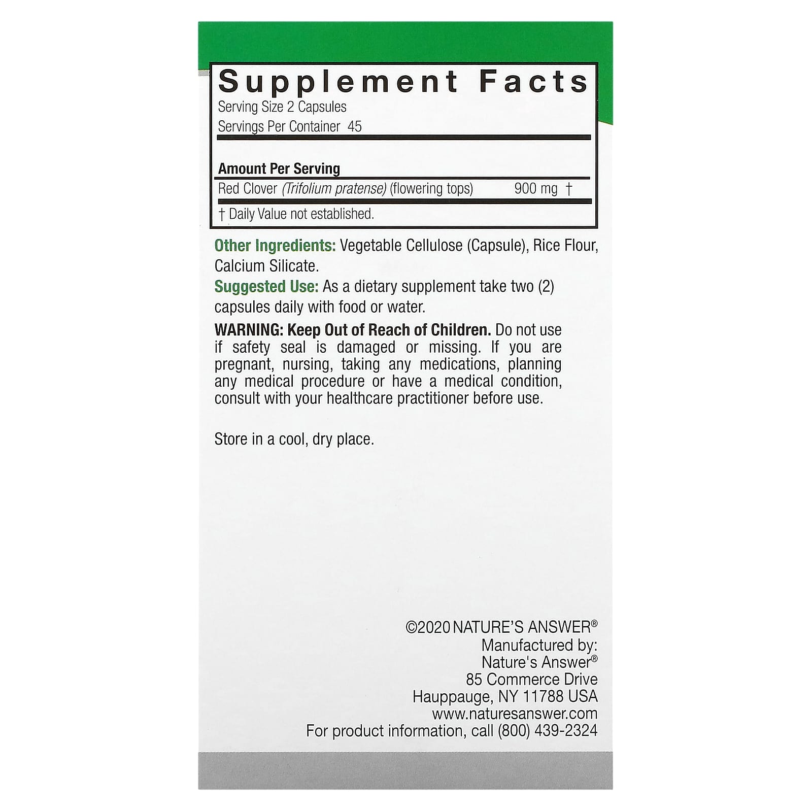 *Some information on the Nature's Answer, Red Clover, 900 mg, 90 Vegetarian Capsuleslabel may be missing, or it may have been written incorrectly. We work hard to keep the information accurate & up to date. Please let us know if you discover any errors.