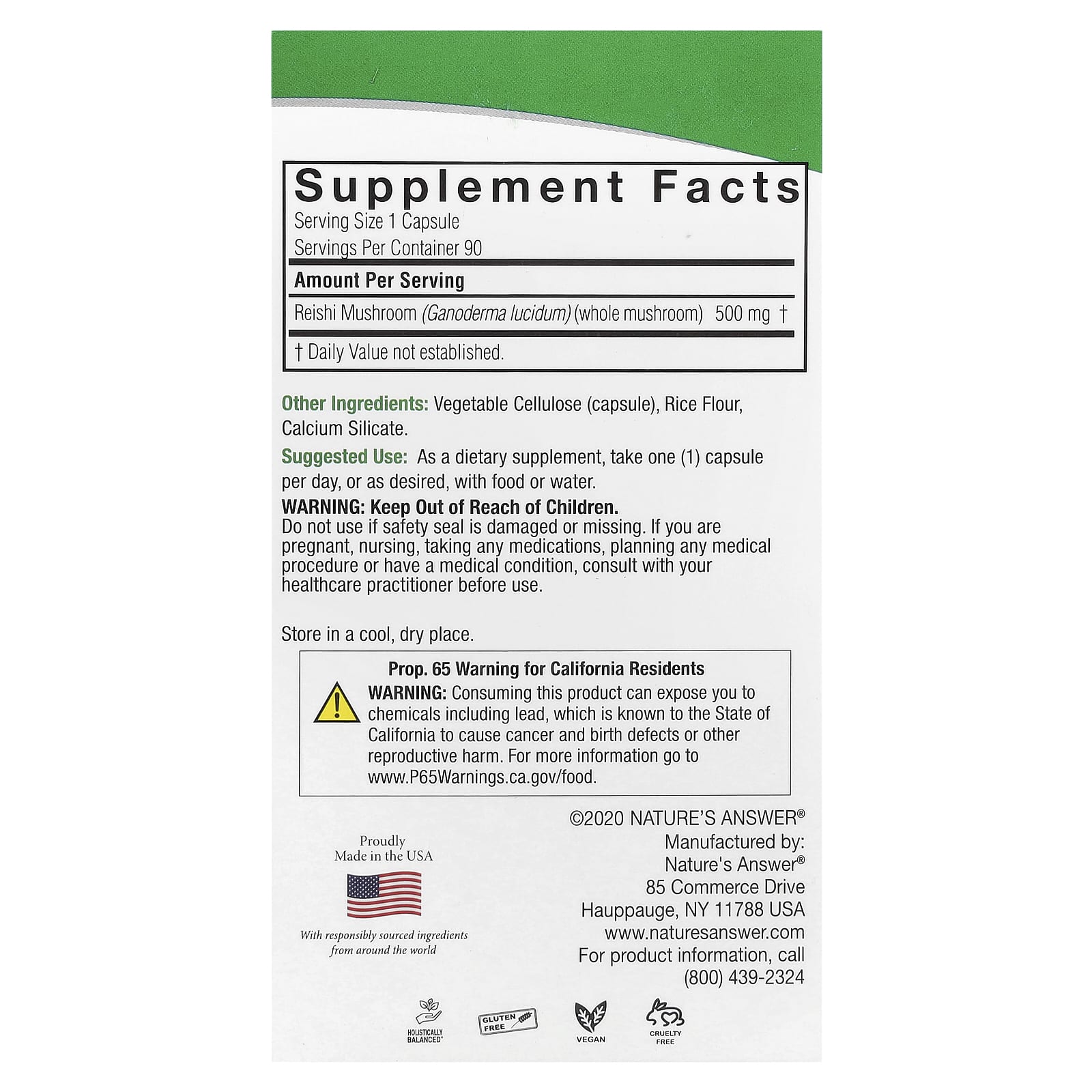 *Some information on the Nature's Answer, Reishi, 500 mg, 90 Vegetarian Capsuleslabel may be missing, or it may have been written incorrectly. We work hard to keep the information accurate & up to date. Please let us know if you discover any errors.