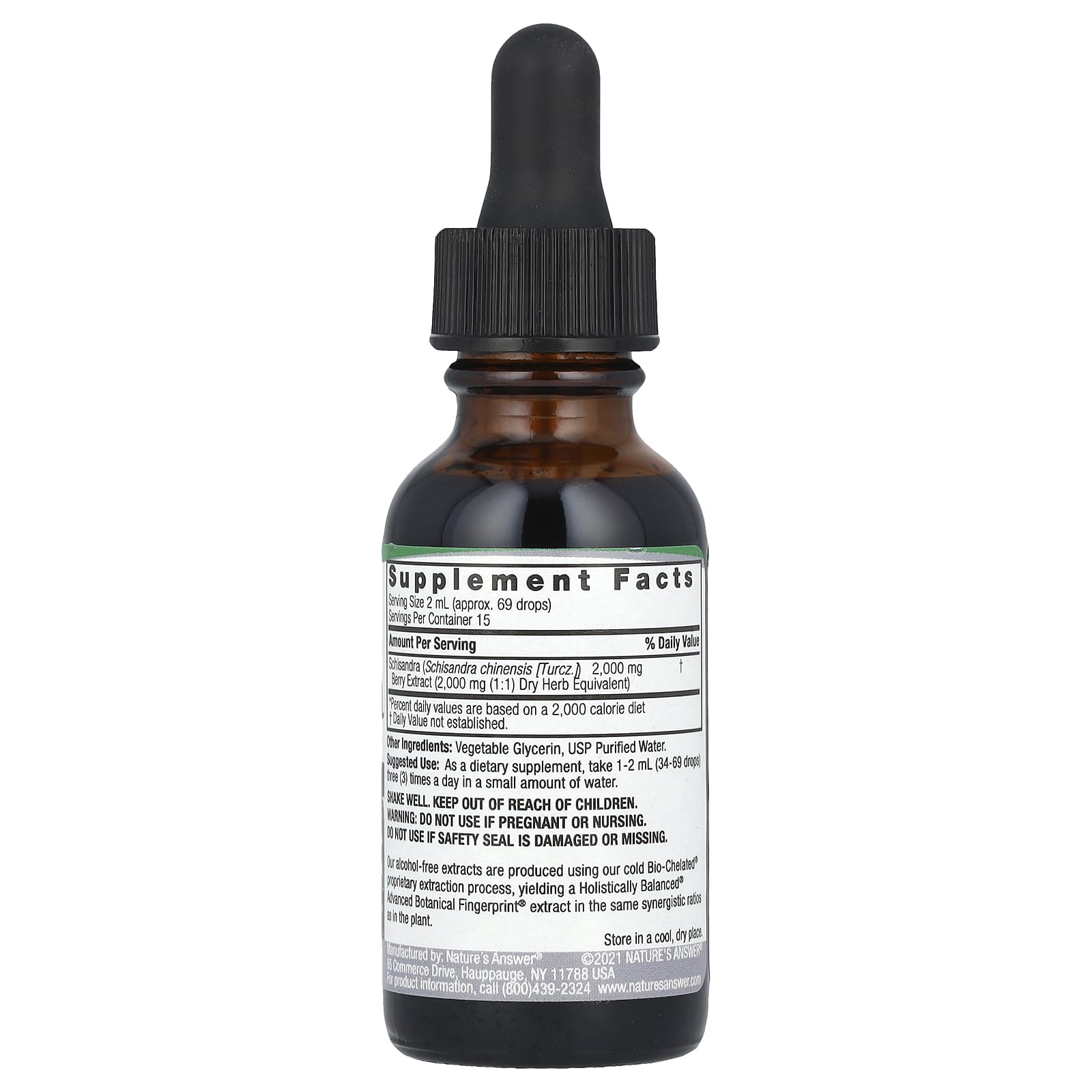 *Some information on the Nature's Answer, Schisandra Extract, Alcohol-Free, 2,000 mg, 1 fl oz (30 ml)label may be missing, or it may have been written incorrectly. We work hard to keep the information accurate & up to date. Please let us know if you discover any errors.