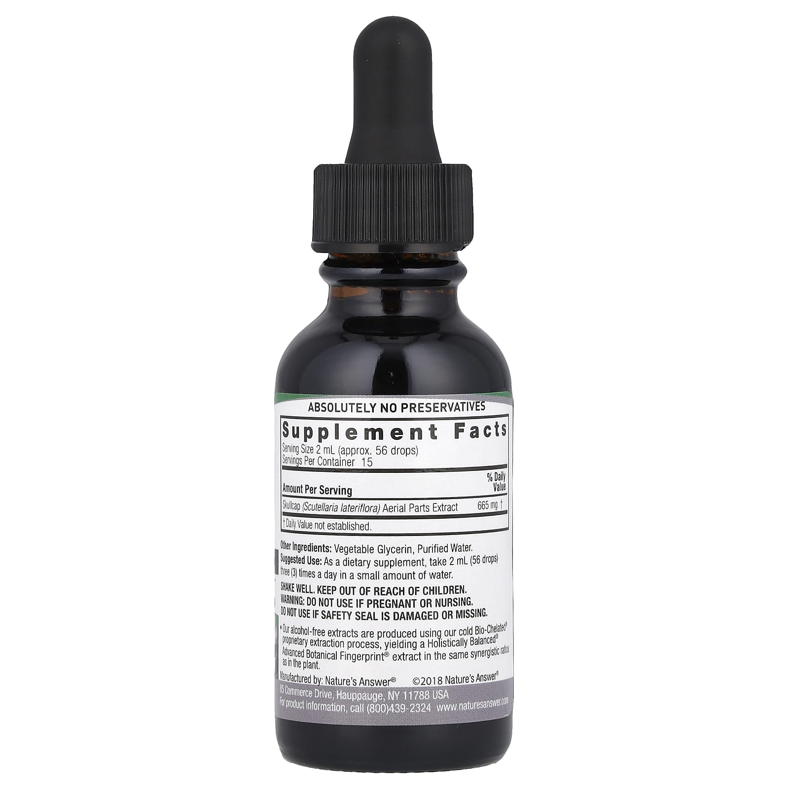 *Some information on the Nature's Answer, Skullcap Extract, Alcohol-Free, 2,000 mg, 1 fl oz (30 ml)label may be missing, or it may have been written incorrectly. We work hard to keep the information accurate & up to date. Please let us know if you discover any errors.
