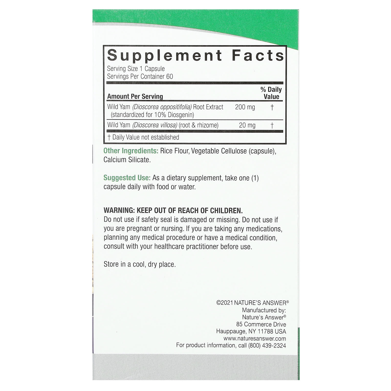 *Some information on the Nature's Answer, Wild Yam, 220 mg , 60 Vegetarian Capsuleslabel may be missing, or it may have been written incorrectly. We work hard to keep the information accurate & up to date. Please let us know if you discover any errors.