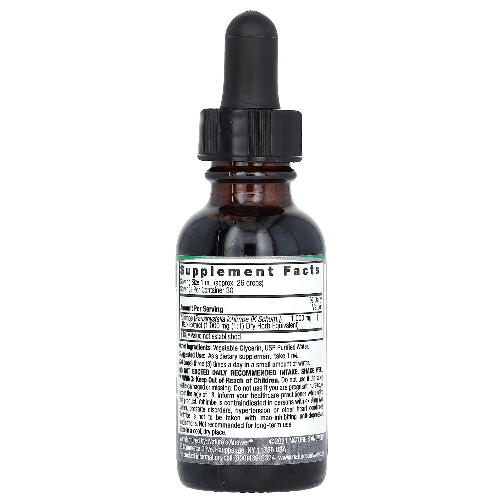 *Some information on the Nature's Answer, Yohimbe Bark, Alcohol-Free, 1,000 mg, 1 fl oz (30 ml)label may be missing, or it may have been written incorrectly. We work hard to keep the information accurate & up to date. Please let us know if you discover any errors.